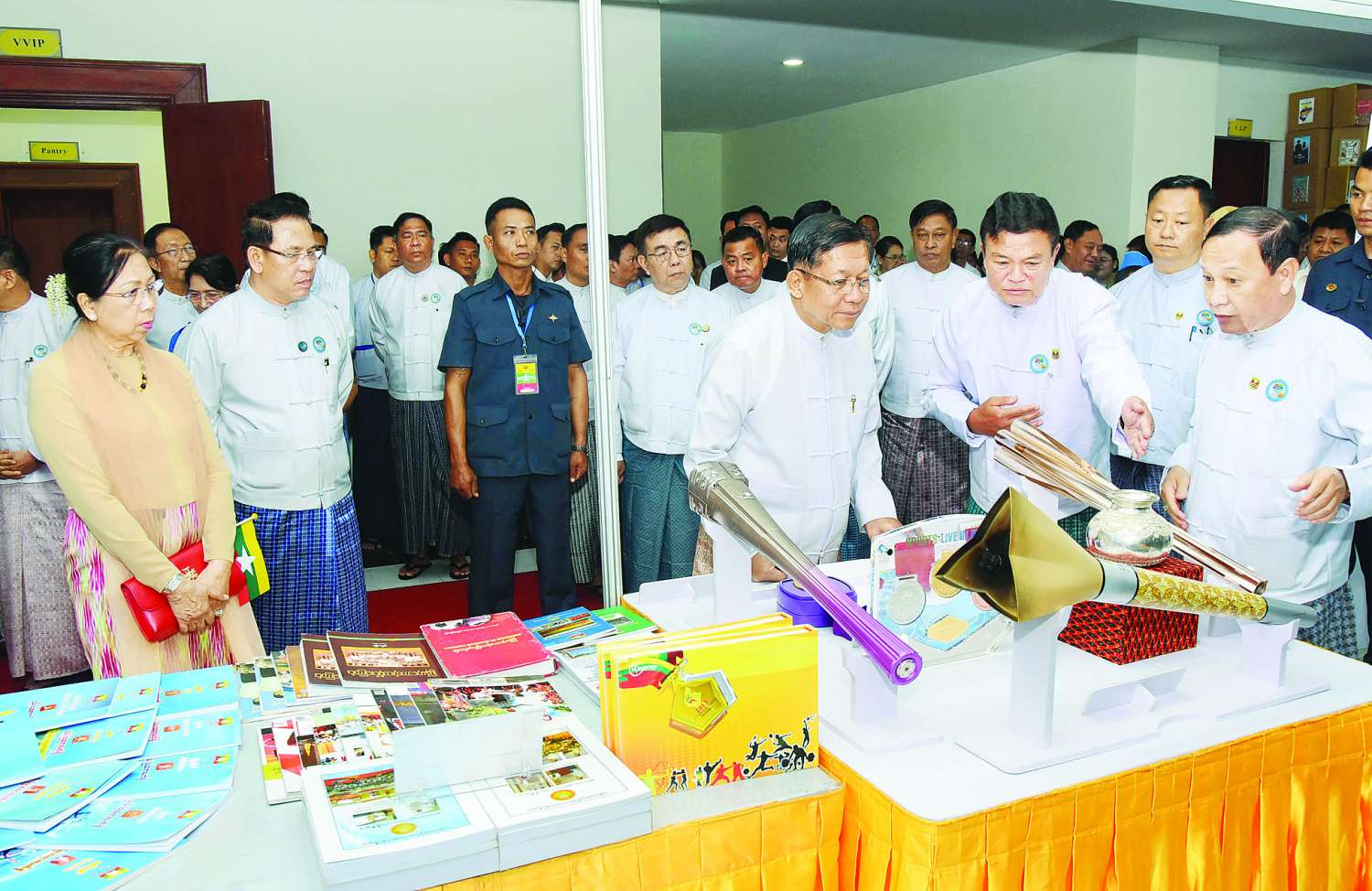 ထို့နောက် နိုင်ငံတော်စီမံအုပ်ချုပ်ရေးကောင်စီဥက္ကဋ္ဌ နိုင်ငံတော်ဝန်ကြီးချုပ်နှင့် ဇနီး၊ အခမ်းအနားတက်ရောက်လာကြသူများသည် (၇၆) နှစ်မြောက် လွတ်လပ်ရေးနေ့အထိမ်းအမှတ် လူငယ်နှင့်စာပေအနုပညာပွဲတော်ပြခန်းများ ခင်းကျင်းပြသထားမှုကို စိတ်ပါဝင်စားစွာဖြင့် လှည့်လည်ကြည့်ရှုကြသည်။