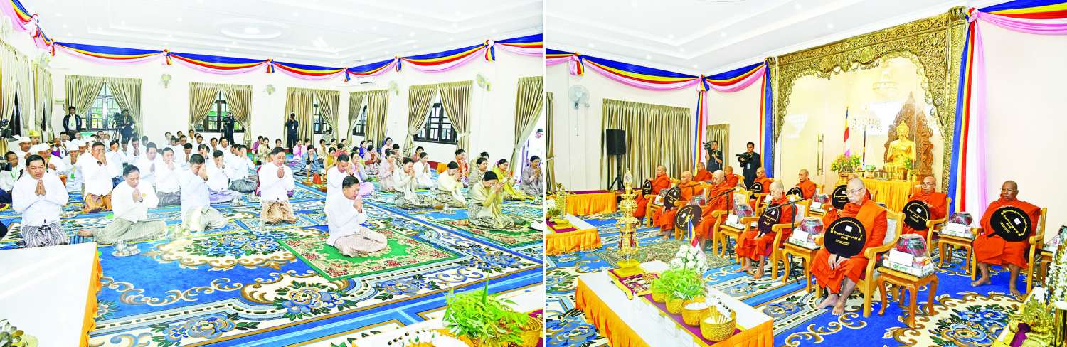 ဦးစွာ အခမ်းအနားကို “နမောတဿ” သုံးကြိမ်ရွတ်ဆို ဘုရားကန်တော့ဖွင့်လှစ်ပြီး နိုင်ငံတော်စီမံအုပ်ချုပ်ရေးကောင်စီဥက္ကဋ္ဌ နိုင်ငံတော်ဝန်ကြီးချုပ်နှင့် ဇနီး၊ အခမ်းအနားတက်ရောက်လာကြသူများက ပါဠိဆရာတော်ကြီးထံမှ ကိုးပါးသီလခံယူဆောက်တည်ကြကာ ဥပသကာများက ပရိတ်ပန်း၊ ပရိတ်ရေ၊ ပရိတ်ချည်၊ ပရိတ်သဲများကို သံဃာတော်များထံ ဆက်ကပ်သည်။ ထို့နောက် သံဃာတော်အရှင်သူမြတ်တို့ ရွတ်ပွားချီးမြှင့်တော်မူကြသည့် ပရိတ်တရားတော်များကို နာယူကြည်ညိုကြသည်။
