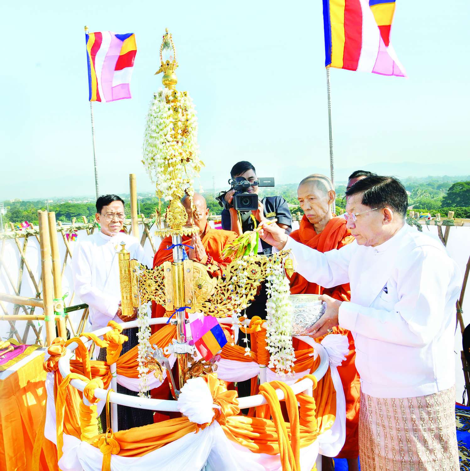 ဆက်လက်၍ ရွှေထီးတော်တင်လှူပူဇော်ခြင်းမင်္ဂလာအခမ်းအနားကို ဆက်လက်ကျင်းပရာ နိုင်ငံတော်စီမံအုပ်ချုပ်ရေးကောင်စီဥက္ကဋ္ဌ နိုင်ငံတော်ဝန်ကြီးချုပ်၏ဇနီးနှင့် အဖွဲ့ဝင်များ၊ အခမ်းအနားတက်ရောက်လာကြသူများနှင့် ဒေသခံပြည်သူများက မင်္ဂလာကြိုးဆွဲ၍ ရတနာစိန်ဖူးတော်၊ ငှက်မြတ်နားတော်တို့အား မင်္ဂလာရထားပျံဖြင့် စေတီတော်အထွတ်သို့ ပင့်ဆောင်ကြပြီး နိုင်ငံတော်စီမံအုပ်ချုပ်ရေးကောင်စီဥက္ကဋ္ဌ နိုင်ငံတော်ဝန်ကြီးချုပ်နှင့် အဖွဲ့ဝင်များက ရတနာစိန်ဖူးတော်၊ ငှက်မြတ်နားတော်တို့ကို စေတီတော်အထွတ်တွင် တင်လှူပူဇော်၍ ပရိတ်နံ့သာရည်များ ပက်ဖျန်းကြသည်။