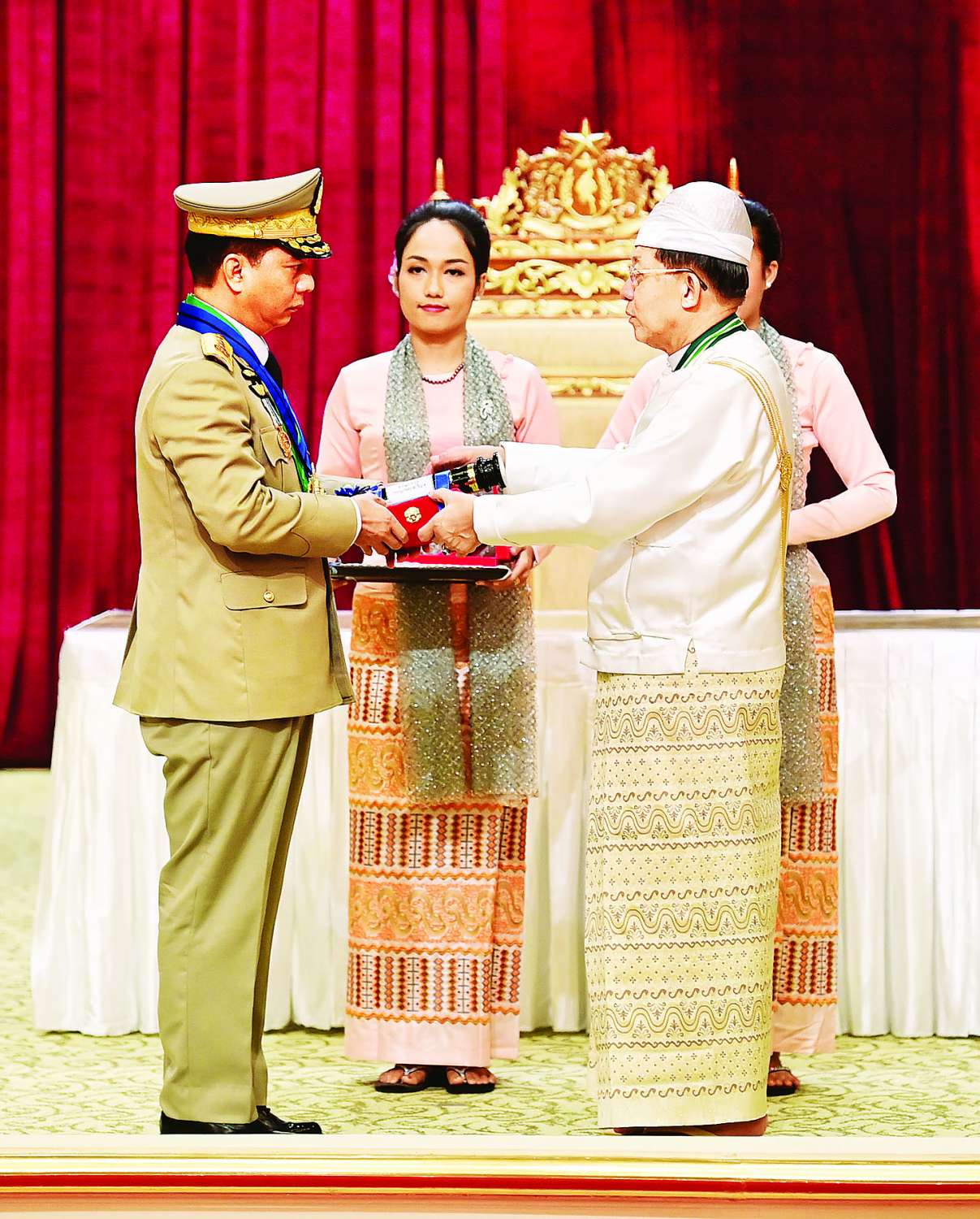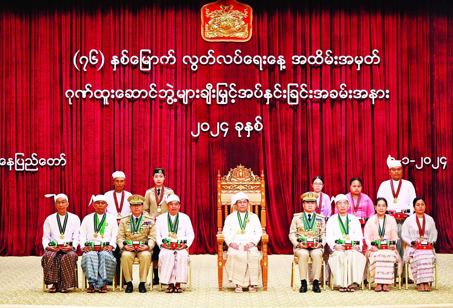 (၇၆)နှစ်မြောက်လွတ်လပ်ရေးနေ့အထိမ်းအမှတ် ဂုဏ်ထူးဆောင်ဘွဲ့များ ချီးမြှင့်အပ်နှင်းခြင်းအခမ်းအနားကို နိုင်ငံတော်စီမံအုပ်ချုပ်ရေးကောင်စီဥက္ကဋ္ဌရုံး သဘင်ဆောင်၌ ယနေ့နံနက်ပိုင်းတွင်ကျင်းပရာ နိုင်ငံတော်စီမံအုပ်ချုပ်ရေးကောင်စီဥက္ကဋ္ဌ နိုင်ငံတော်ဝန်ကြီးချုပ် ဗိုလ်ချုပ်မှူးကြီး သတိုးမဟာသရေစည်သူ သတိုးသီရိသုဓမ္မမင်းအောင်လှိုင် တက်ရောက်အမှာစကားပြောကြားပြီး ဂုဏ်ထူးဆောင်ဘွဲ့များ ချီးမြှင့်အပ်နှင်းသည်။