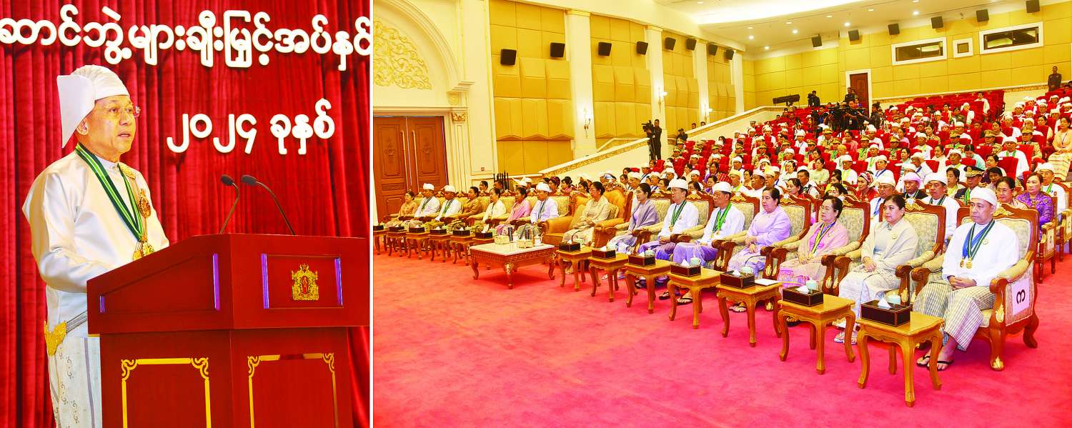 နိုင်ငံတော်တည်ဆောက်ရေးလုပ်ငန်းများကို အကောင်အထည်ဖော်ဆောင်ရွက်ရာတွင် နိုင်ငံတော်စီမံအုပ်ချုပ်ရေးကောင်စီ၊ ပြည်ထောင်စုအစိုးရစသည့် တိုင်းပြည်၏ အဓိကမဏ္ဍိုင်ကြီးများက တာဝန်ရှိသူများနှင့်အတူ ကဏ္ဍပေါင်းစုံ၊ ဘက်ပေါင်းစုံက ပုဂ္ဂိုလ်အသီးသီးတို့ကလည်း လက်တွဲကြိုးပမ်းနေကြခြင်းဖြစ်ပါကြောင်း၊ မိမိတို့နိုင်ငံ၏ (၇၆)နှစ်မြောက်နေ့ထူးနေ့မြတ် အခါသမယတွင် နိုင်ငံတော်အတွက် ထူးကဲသာလွန်စွာ အကျိုးပြုခဲ့ကြသူများကို ဂုဏ်ပြုချီးမြှင့်နိုင်ရန်အတွက် ယခုအခမ်းအနားကို ကျင်းပရခြင်းဖြစ်ပါကြောင်း။