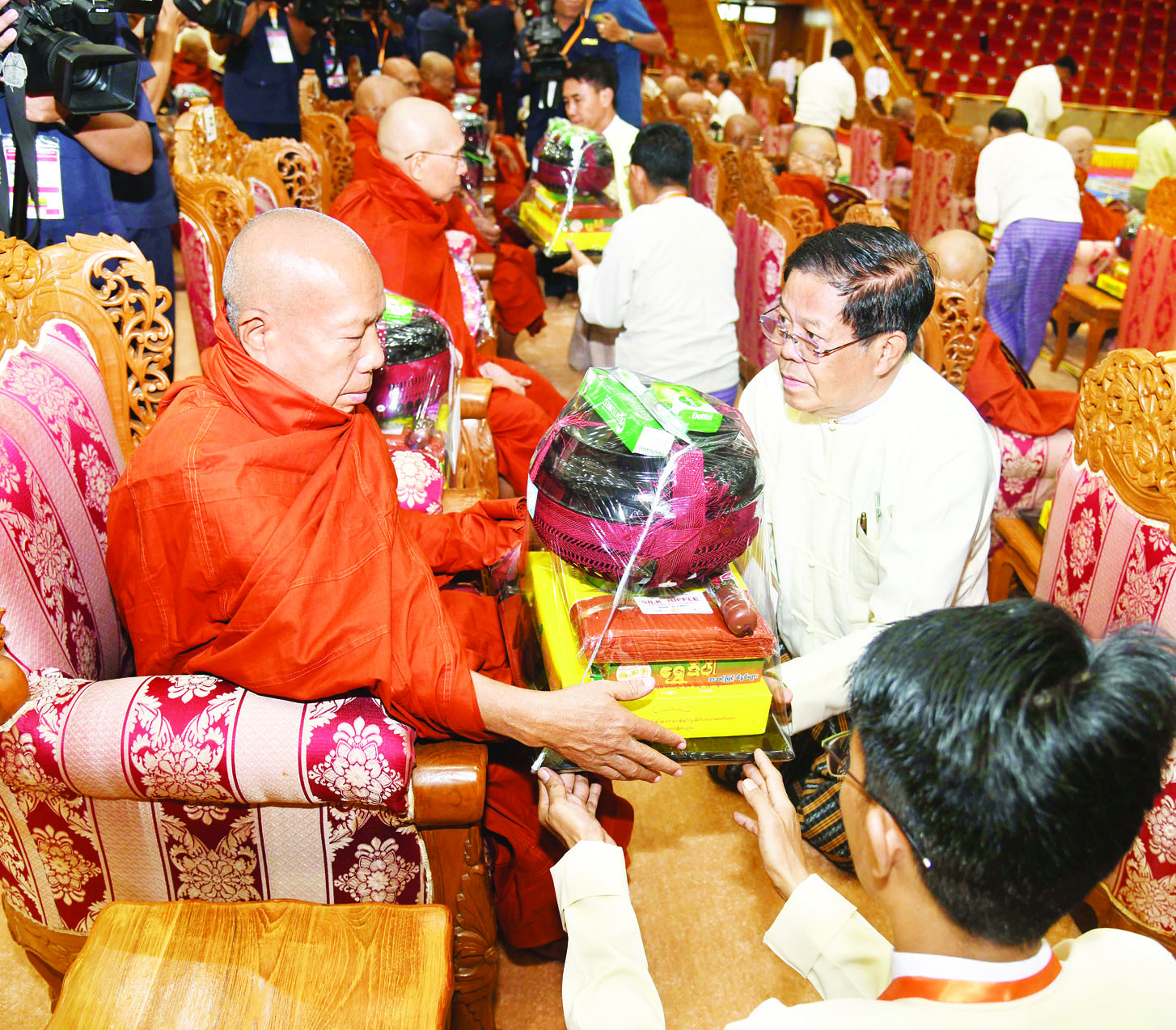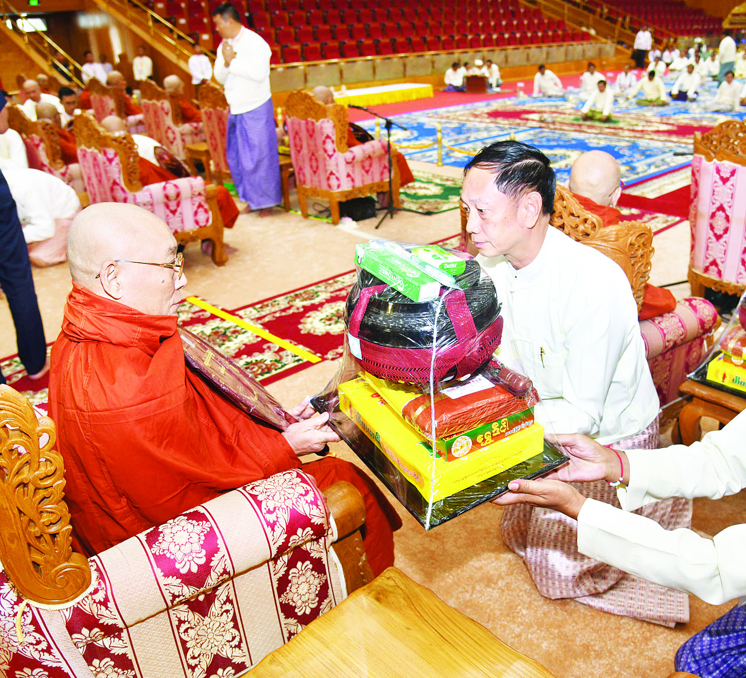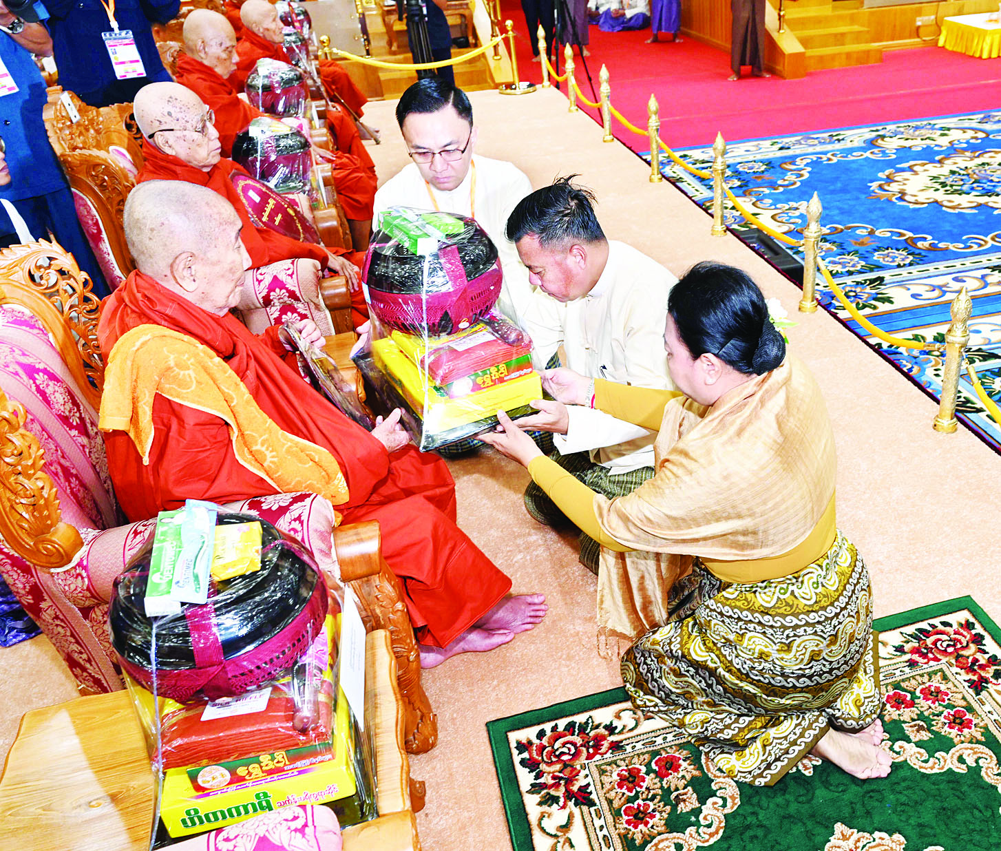 ယင်းနောက် နိုင်ငံတော်စီမံအုပ်ချုပ်ရေးကောင်စီဥက္ကဋ္ဌ နိုင်ငံတော်ဝန်ကြီးချုပ်နှင့် ဇနီးတို့က နိုင်ငံတော်သံဃမဟာနာယက အဖွဲ့ဥက္ကဋ္ဌ သန်လျင်မင်းကျောင်းဆရာတော် ဘုရားကြီးထံသို့လည်းကောင်း၊ ကောင်စီဒုတိယဥက္ကဋ္ဌ ဒုတိယဝန်ကြီးချုပ်နှင့် ဇနီးတို့က နိုင်ငံတော်သံဃမဟာ နာယကအဖွဲ့ အကျိုးတော်ဆောင်၊ မန္တလေးမြို့၊ မစိုးရိမ်တိုက်သစ် မဟာနာယက ဆရာတော်ကြီးထံသို့လည်းကောင်း၊ ကောင်စီ အတွင်းရေးမှူးနှင့် ဇနီး၊ တွဲဖက်အတွင်းရေးမှူးနှင့် ဇနီး၊ ကောင်စီအဖွဲ့ဝင်များနှင့်ဇနီးများ၊ အခမ်းအနားသို့ တက်ရောက်လာသည့် အကြီးအကဲများက သာသနာတော်ဆိုင်ရာ ဘွဲ့တံဆိပ်တော်ဆက်ကပ်ခံယူမည့် ဆရာတော်ကြီးများထံသို့လည်းကောင်း လှူဖွယ်ဝတ္ထုပစ္စည်းများကို ဆက်ကပ်လှူဒါန်းကြသည်။