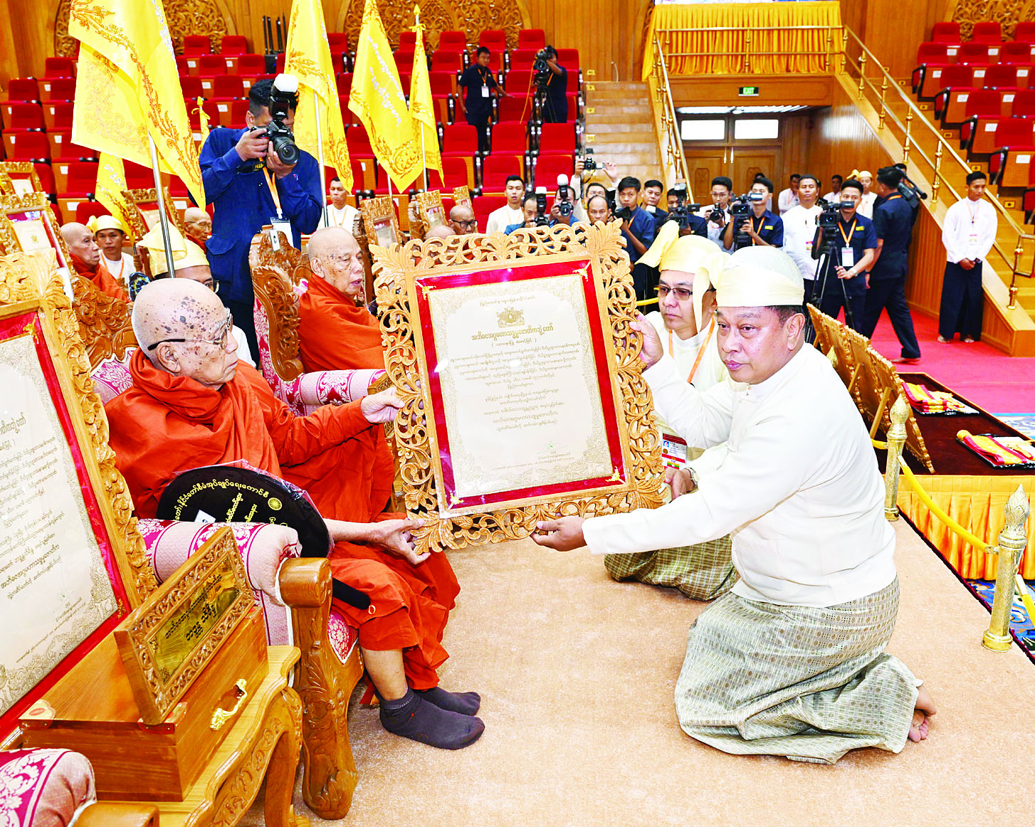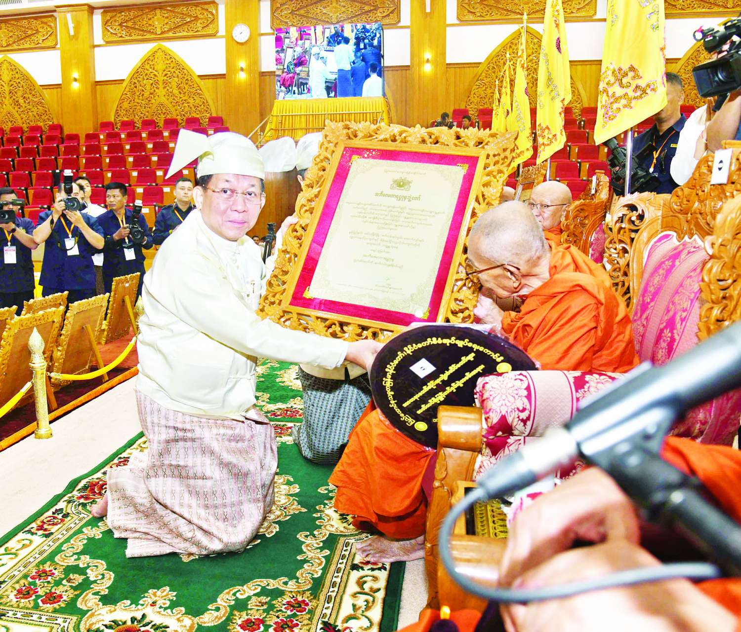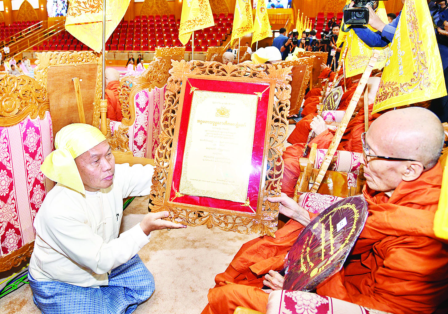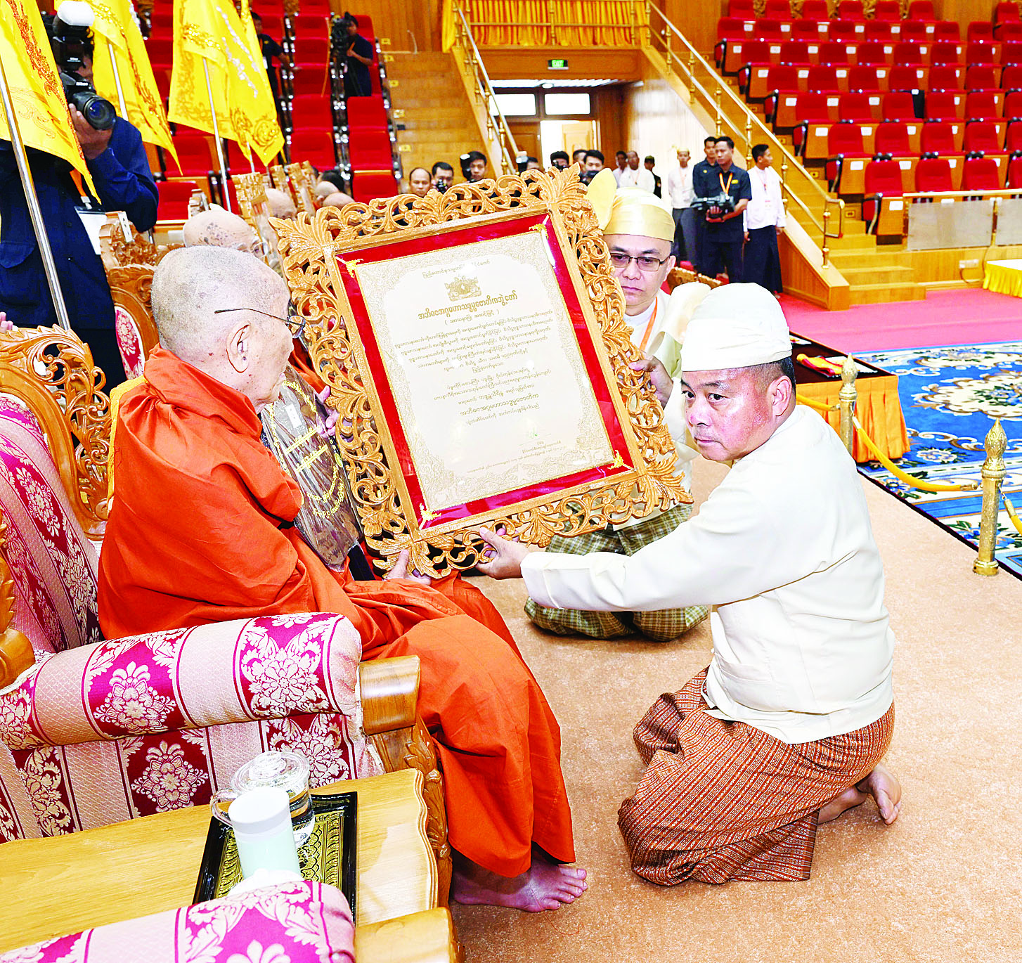 ဆက်လက်၍ ကောင်စီဝင်များ၊ ပြည်ထောင်စုအဆင့်ပုဂ္ဂိုလ်များ၊ ပြည်ထောင်စုဝန်ကြီးများ၊ ကာကွယ်ရေးဦးစီးချုပ်ရုံးမှ တပ်မတော်အရာရှိကြီးများနှင့် တာဝန်ရှိသူများက အဘိဓဇအဂ္ဂမဟာ သဒ္ဓမ္မဇောတိက၊ အဘိဓဇမဟာရဋ္ဌဂုရု၊ အဂ္ဂမဟာပဏ္ဍိတ၊ အဂ္ဂမဟာ သဒ္ဓမ္မဇောတိကဓဇ၊ အဂ္ဂမဟာ ဂန္ထဝါစက ပဏ္ဍိတ၊ အဂ္ဂမဟာ ကမ္မဋ္ဌာနာစရိယဘွဲ့ရရှိသည့် ဆရာတော်ကြီးများထံ ဘွဲ့တံဆိပ်တော်နှင့် အဆောင်အယောင်များကို ဆက်ကပ်ပူဇော်ကြသည်။