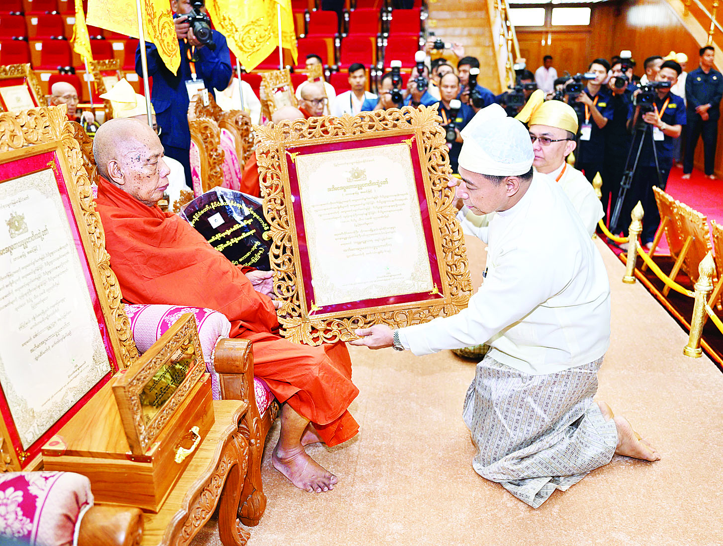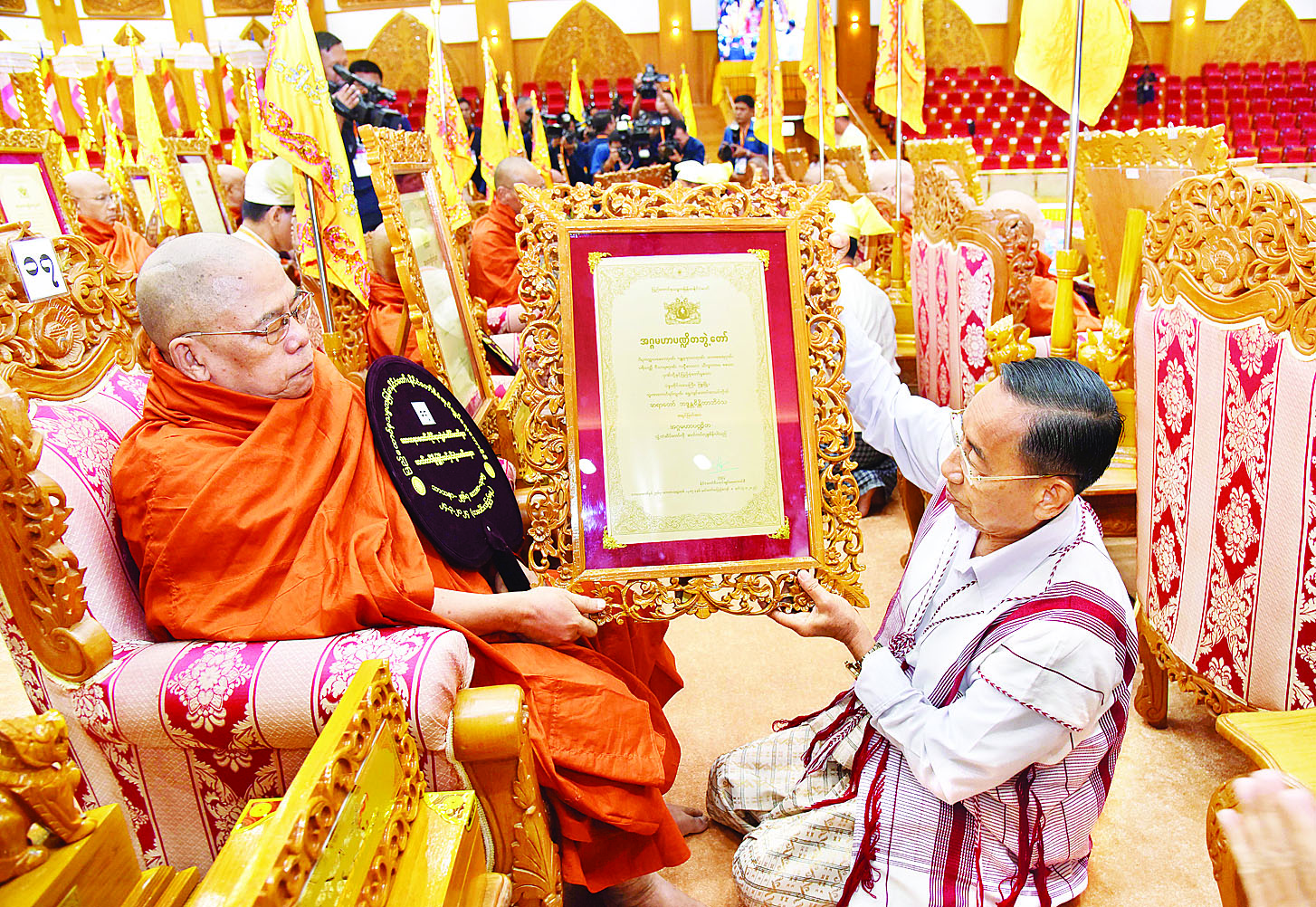 ထို့နောက် ဘွဲ့တံဆိပ်တော်ရ ဆရာတော်ကြီးများအား သာသနာတော်ဆိုင်ရာ ဘွဲ့တံဆိပ်တော်များ ဆက်ကပ်ပူဇော်ကြရာ နိုင်ငံတော်စီမံအုပ်ချုပ်ရေးကောင်စီဥက္ကဋ္ဌ နိုင်ငံတော်ဝန်ကြီးချုပ်က အဘိဓဇမဟာရဋ္ဌဂုရု ဘွဲ့တံဆိပ်တော်ရ မော်လမြိုင်မြို့၊ ဗုဒ္ဓသာသနာ့သိပ္ပံကျောင်းနှင့် စိန်မမပါဠိတက္ကသိုလ်ကျောင်းတိုက်ဆရာတော် ဘဒ္ဒန္တသုမနထံ ဘွဲ့တံဆိပ်တော်နှင့် အဆောင်အယောင်များကို ဆက်ကပ်ပူဇော်သည်။
