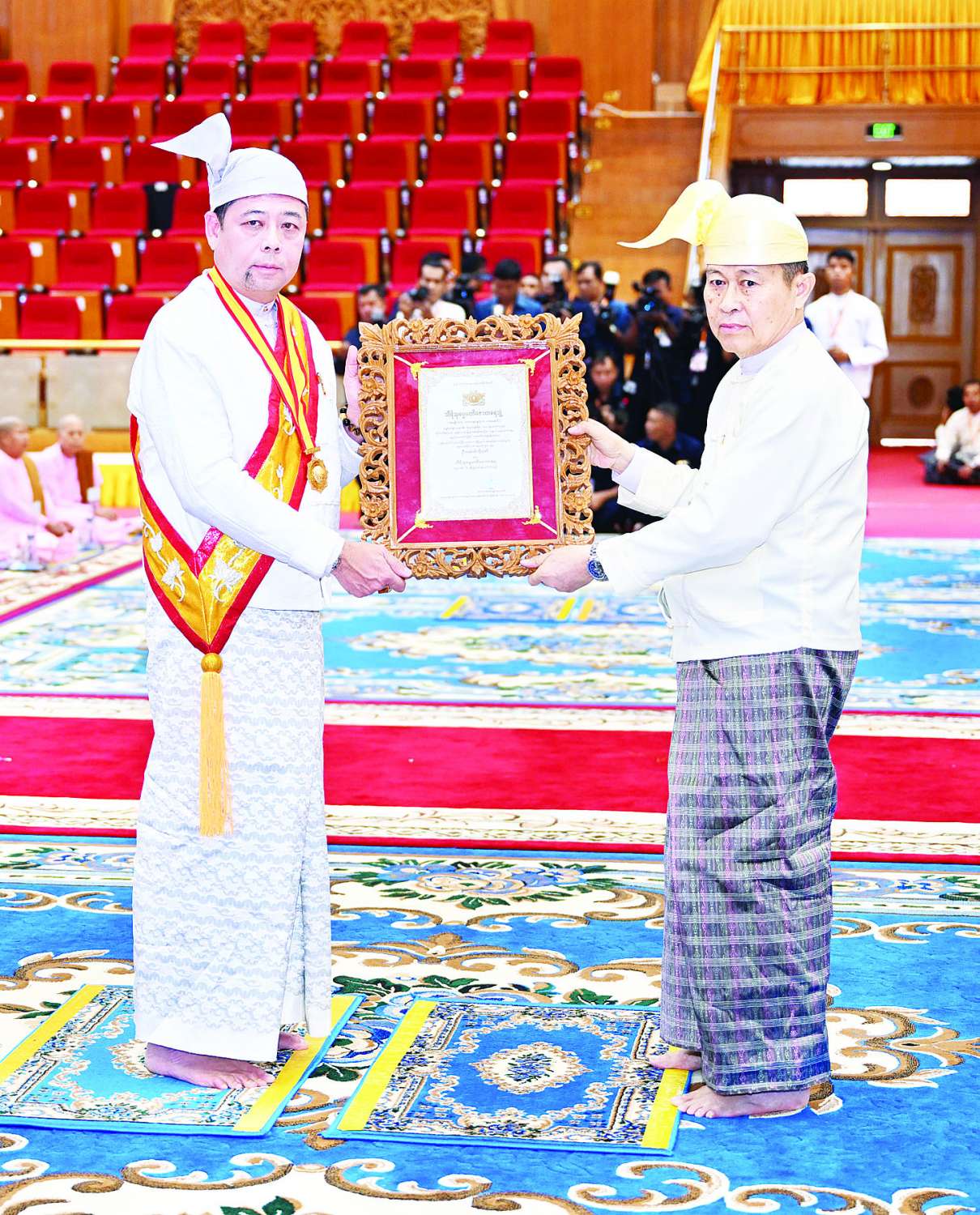 ဆက်လက်၍ သာသနာနုဂ္ဂဟဘွဲ့တံဆိပ်များကို ချီးမြှင့်အပ်နှင်းရာ နိုင်ငံတော်စီမံအုပ်ချုပ်ရေးကောင်စီဥက္ကဋ္ဌ နိုင်ငံတော်ဝန်ကြီးချုပ်က အဂ္ဂမဟာသီရိသုဓမ္မ မဏိဇောတဓရ ဘွဲ့ရရှိသူ ဒေါက်တာမောင်မောင်ဦး၊ သီရိသုဓမ္မမဏိဇောတဓရဘွဲ့ ရရှိသူများဖြစ်ကြသည့် ဦးမန်းစိန်နှင့် ဦးဝမ်ရှင်းရွှေတို့အား ဘွဲ့တံဆိပ်နှင့် အဆောင်အယောင်များ ချီးမြှင့်အပ်နှင်းသည်။