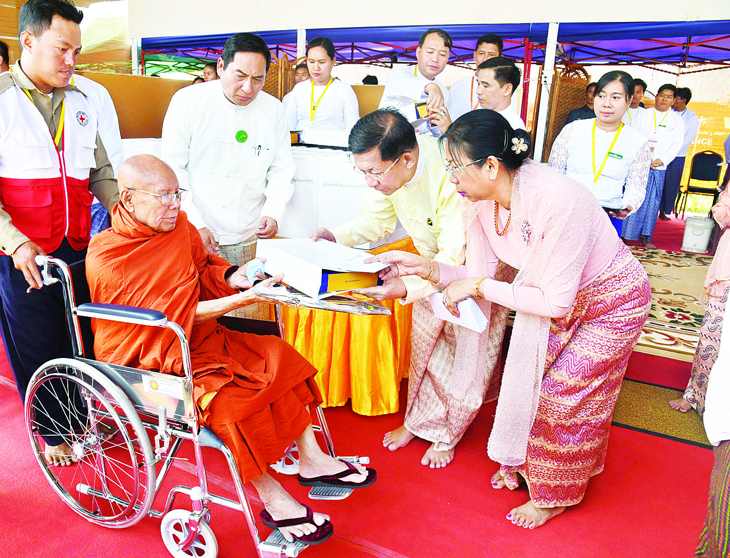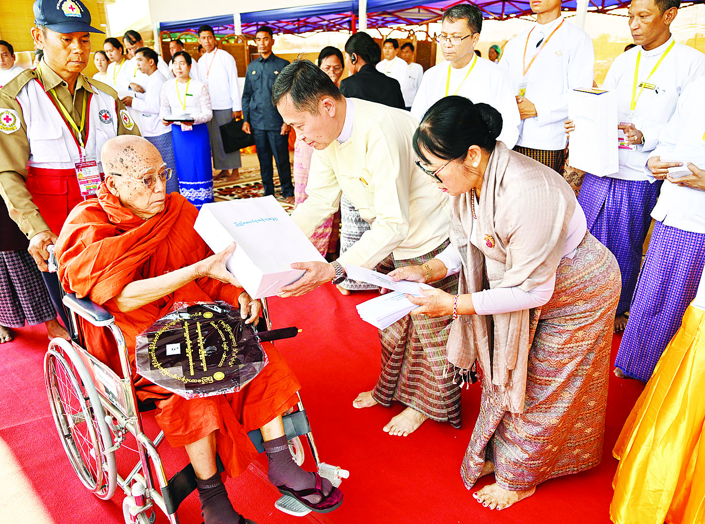ယင်းနောက် နိုင်ငံတော်စီမံအုပ်ချုပ်ရေးကောင်စီဥက္ကဋ္ဌ နိုင်ငံတော်ဝန်ကြီးချုပ်၏ဇနီးက အဂ္ဂမဟာ ဂန္ထဝါစကပဏ္ဍိတ ဘွဲ့တံဆိပ်တော်ရ စစ်ကိုင်းမြို့၊ ဇေယျသိင်္ဂီသီလရှင်စာသင်တိုက် သီလရှင်ဆရာကြီး ဒေါ်ဂုဏဝတီနှင့် မုံရွာမြို့၊ ဧသုဝတီသီလရှင်စာသင်တိုက် သီလရှင်ဆရာကြီး ဒေါ်ဓမ္မေသီတို့ထံ ဘွဲ့တံဆိပ်တော်နှင့် အဆောင်အယောင်များ ဆက်ကပ်ပူဇော်ကြသည်။