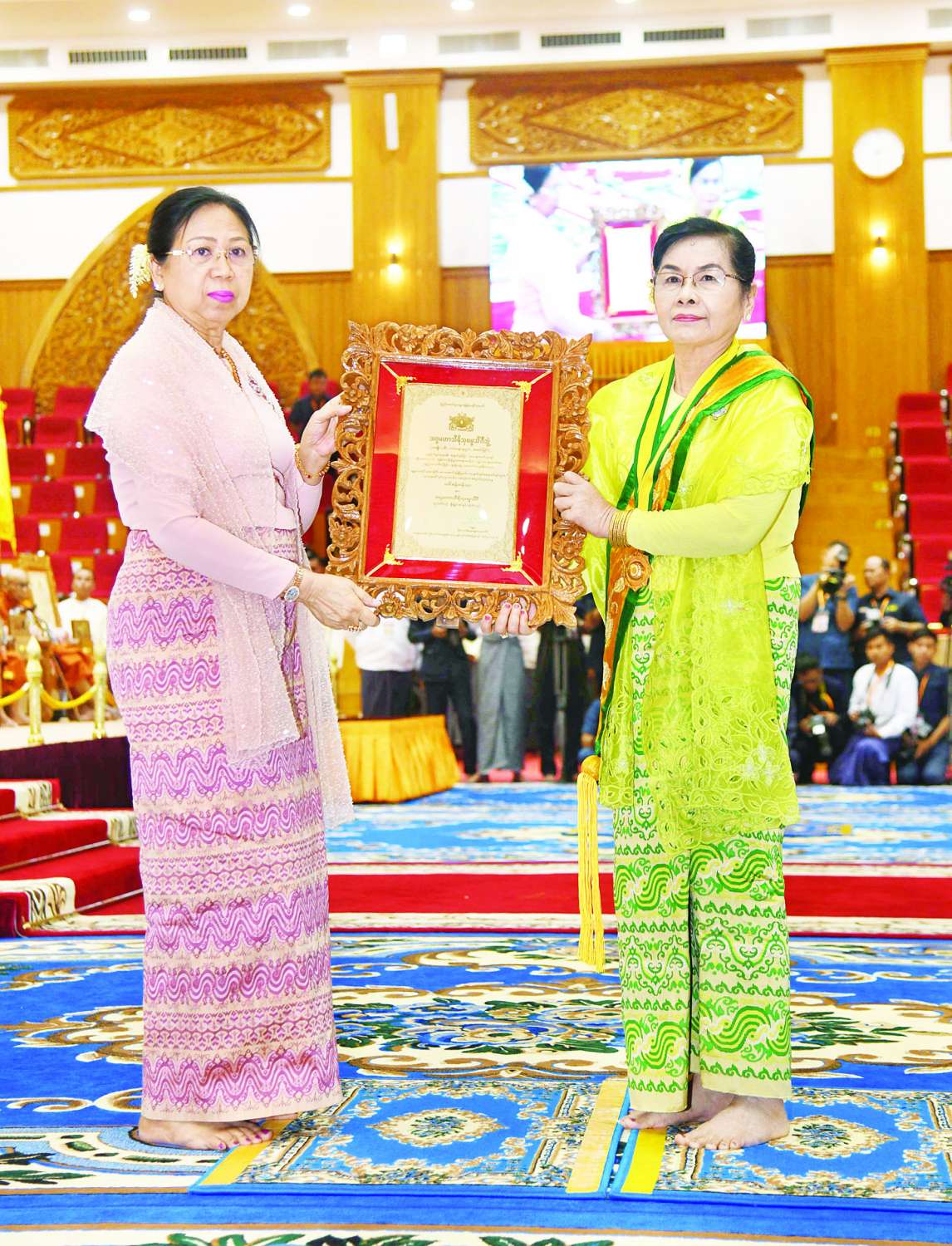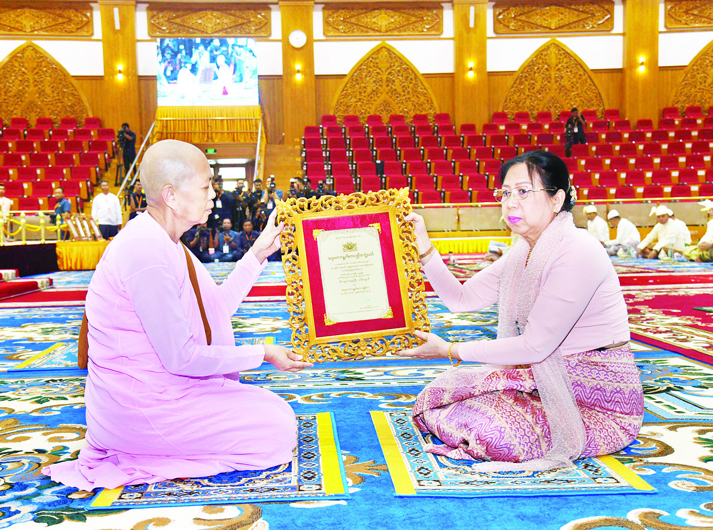 ထို့နောက် နိုင်ငံတော်စီမံအုပ်ချုပ်ရေးကောင်စီဥက္ကဋ္ဌ နိုင်ငံတော်ဝန်ကြီးချုပ်၏ ဇနီးက အဂ္ဂမဟာသီရိ သုဓမ္မသိင်္ဂီဘွဲ့ရရှိကြသည့် ဒေါ်စန်းစန်းဝေနှင့် ဒေါ်နုနုငယ်၊ သီရိသုဓမ္မသိင်္ဂီဘွဲ့ ရရှိကြသည့် ဒေါ်တင်ညွန့်၊ ဒေါ်မြဝင်းနှင့် ဒေါ်နီနီကျော်တို့အားလည်းကောင်း၊ နိုင်ငံတော်စီမံအုပ်ချုပ်ရေးကောင်စီ ဒုတိယဥက္ကဋ္ဌ၊ ဒုတိယဝန်ကြီးချုပ်၏ ဇနီးက သီရိသုဓမ္မသိင်္ဂီဘွဲ့ရရှိကြသည့် ဒေါ်မော်မော်ညွန့်၊ ဒေါ်ဌေးဌေးယဉ်နှင့် ဒေါ်ခိုင်ပြည့်စုံကြိုင်တို့အားလည်းကောင်း ဘွဲ့တံဆိပ်နှင့် အဆောင်အယောင်များကို ချီးမြှင့်အပ်နှင်းသည်။