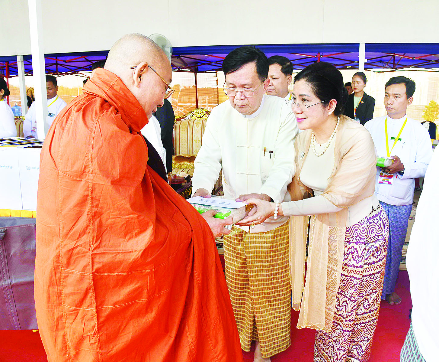 ၂၀၂၄ ခုနှစ် သာသနာတော်ဆိုင်ရာ ဘွဲ့တံဆိပ်တော်များ ဆက်ကပ်ပူဇော်ပွဲ မဟာမင်္ဂလာအခမ်းအနားနှင့် ဆွမ်းဆန်စိမ်းလောင်းလှူပွဲအခမ်းအနားကို ယနေ့မွန်းလွဲပိုင်းတွင် နေပြည်တော်၊ မာရဝိဇယဗုဒ္ဓဥယျာဉ်တော်ပရိဝုဏ်အတွင်းရှိ အဂ္ဂါဓိပတိသာသနာ့ဗိမာန်တော်ကြီး၌ ကျင်းပရာ နိုင်ငံတော်စီမံအုပ်ချုပ်ရေးကောင်စီဥက္ကဋ္ဌ နိုင်ငံတော်ဝန်ကြီးချုပ် ဗိုလ်ချုပ်မှူးကြီး မင်းအောင်လှိုင်နှင့် ဇနီး ဒေါ်ကြူကြူလှတို့ တက်ရောက်ကြည်ညို၍ သာသနာတော်ဆိုင်ရာ ဘွဲ့တံဆိပ်တော်များ ဆက်ကပ်ပူဇော်ပြီး ဆွမ်းဆန်စိမ်းများ လောင်းလှူကြသည်။