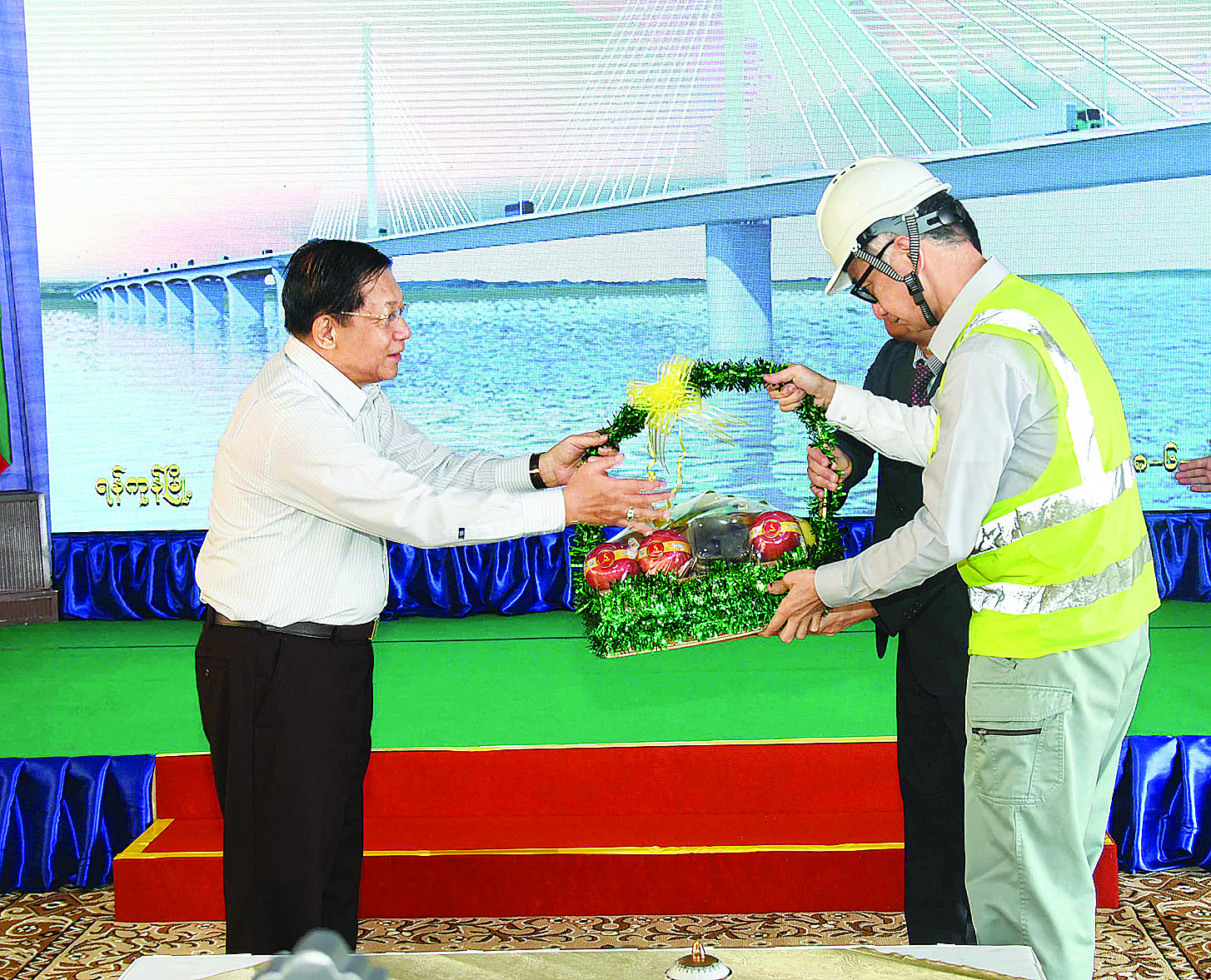 ထို့နောက် နိုင်ငံတော်စီမံအုပ်ချုပ်ရေးကောင်စီဥက္ကဋ္ဌ နိုင်ငံတော်ဝန်ကြီးချုပ်သည် တံတားတည်ဆောက်ရေးတွင်ပါဝင်ခဲ့ကြသည့် တည်ဆောက်ရေးအင်ဂျင်နီယာအဖွဲ့အား သစ်သီးခြင်းနှင့် လက်ဆောင်ပစ္စည်းများပေးအပ်သည်။