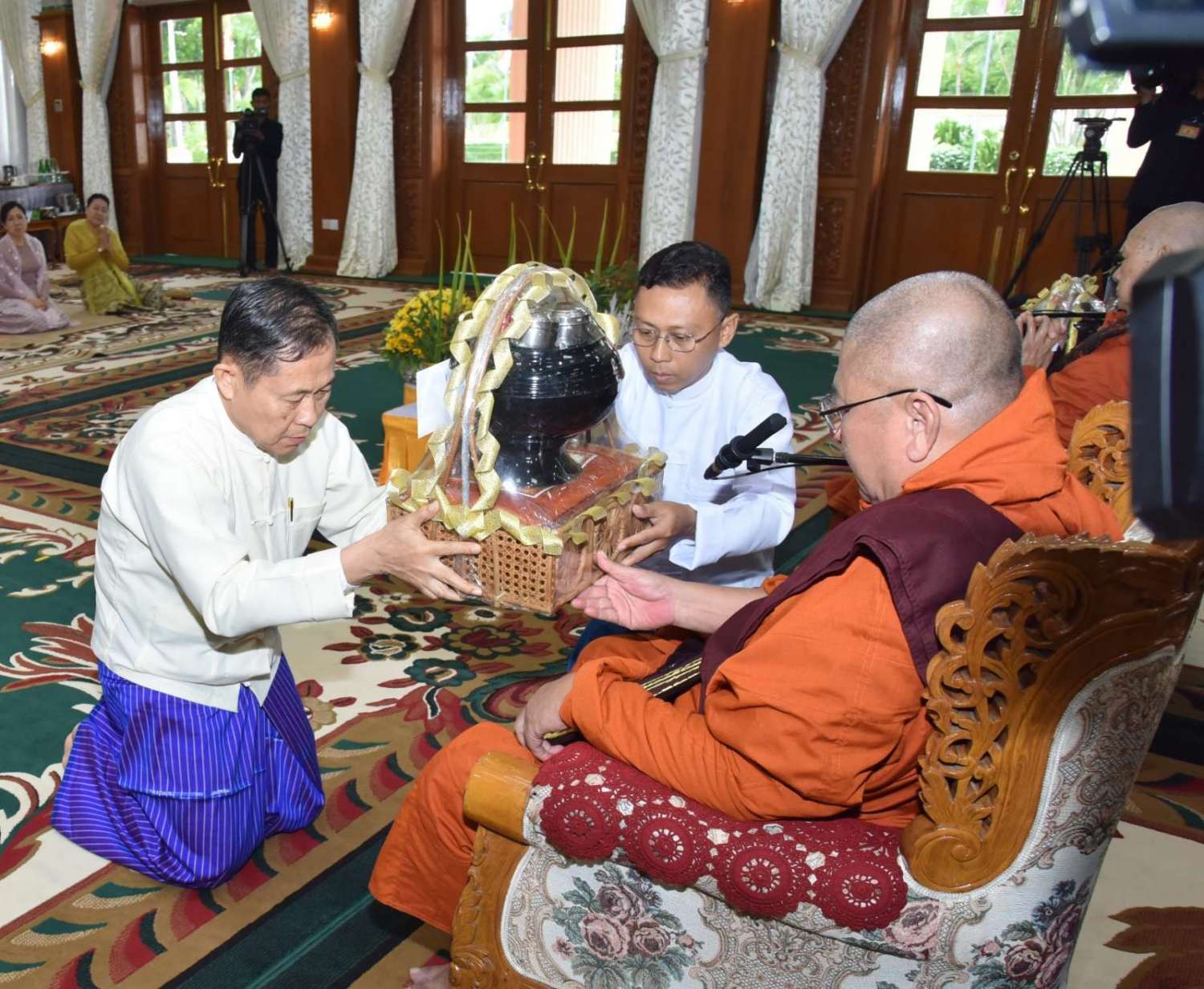 ယင်းနောက် နိုင်ငံတော်စီမံအုပ်ချုပ်ရေးကောင်စီဒုတိယဥက္ကဋ္ဌ ဒုတိယတပ်မတော်ကာကွယ်ရေးဦးစီးချုပ် ကာကွယ်ရေးဦးစီးချုပ် (ကြည်း) က နိုင်ငံတော်သံဃမဟာနာယကအဖွဲ့အကျိုးတော်ဆောင် မစိုးရိမ်တိုက်သစ်ဆရာတော်ကြီးထံ ဝါဆိုသင်္ကန်းနှင့် လှူဖွယ်ပစ္စည်းများကို ဆက်ကပ်လှူဒါန်းသည်။
