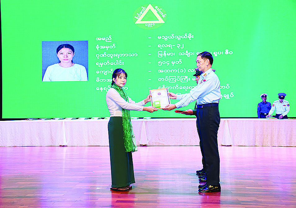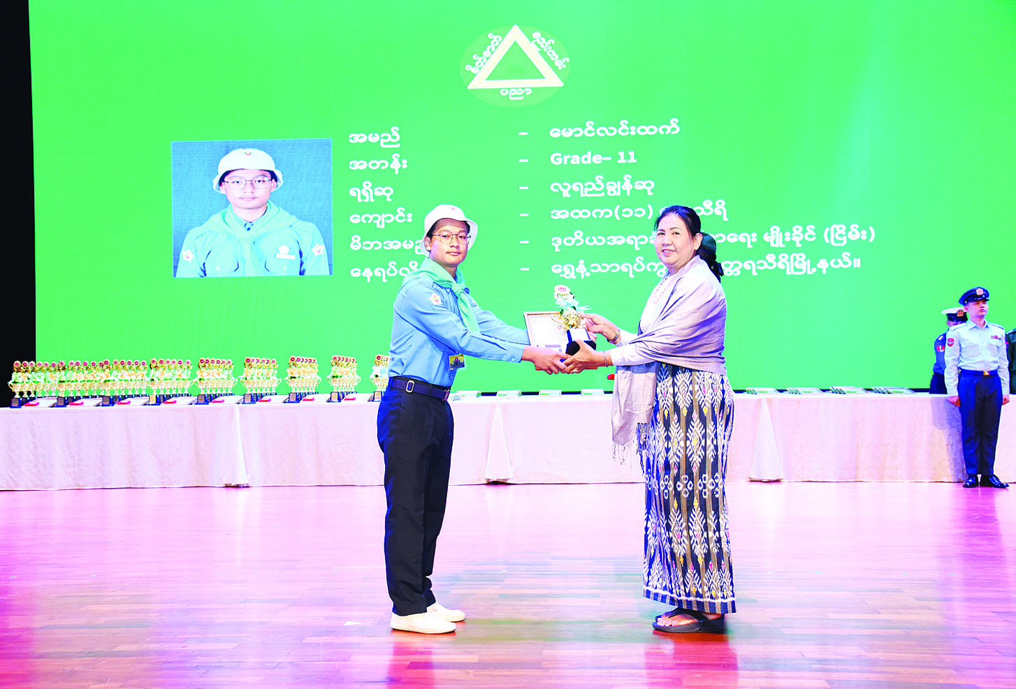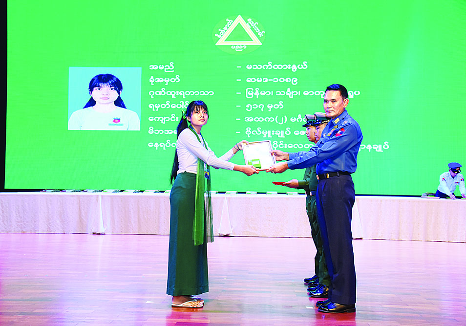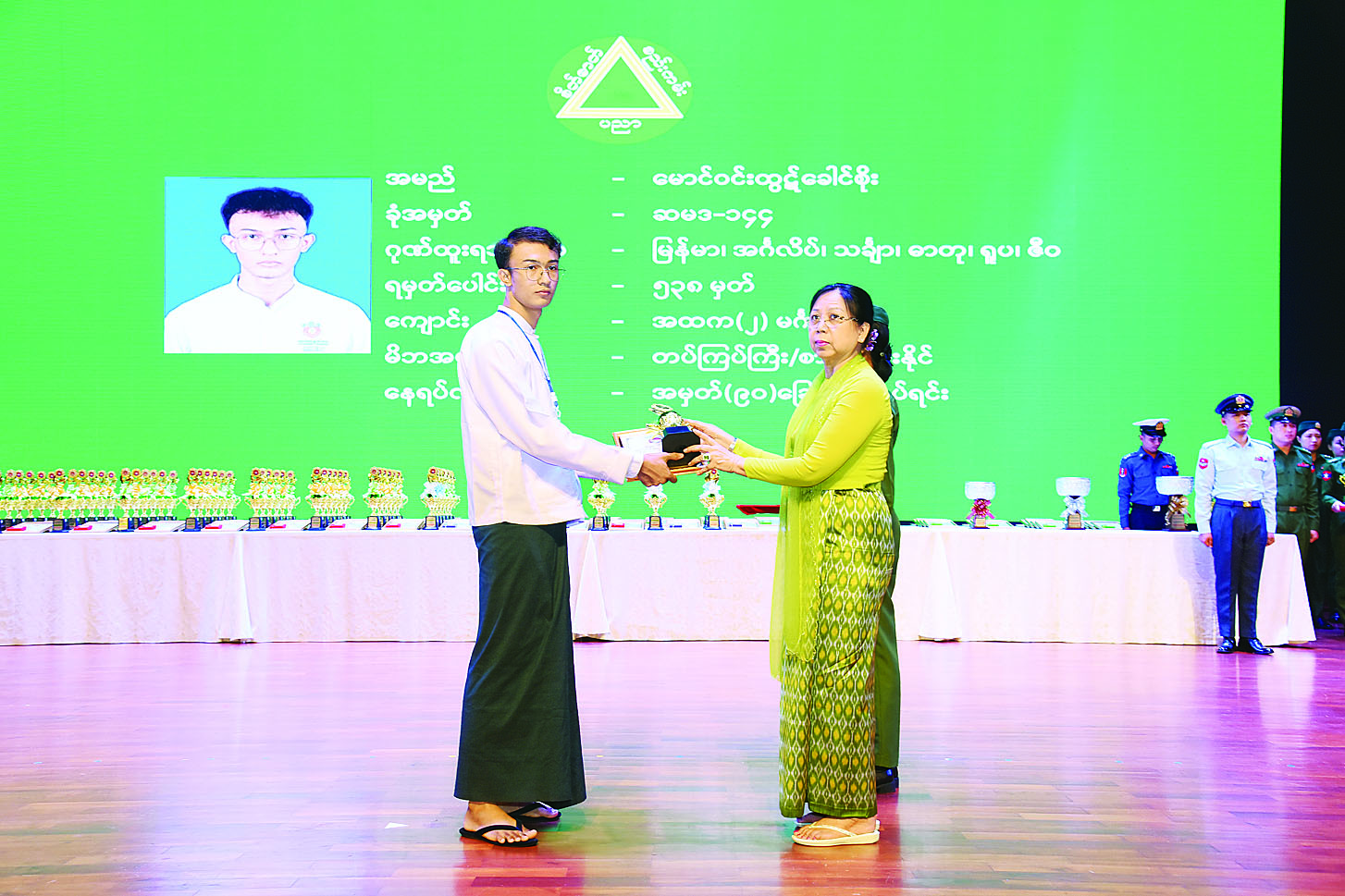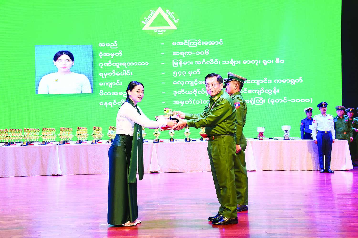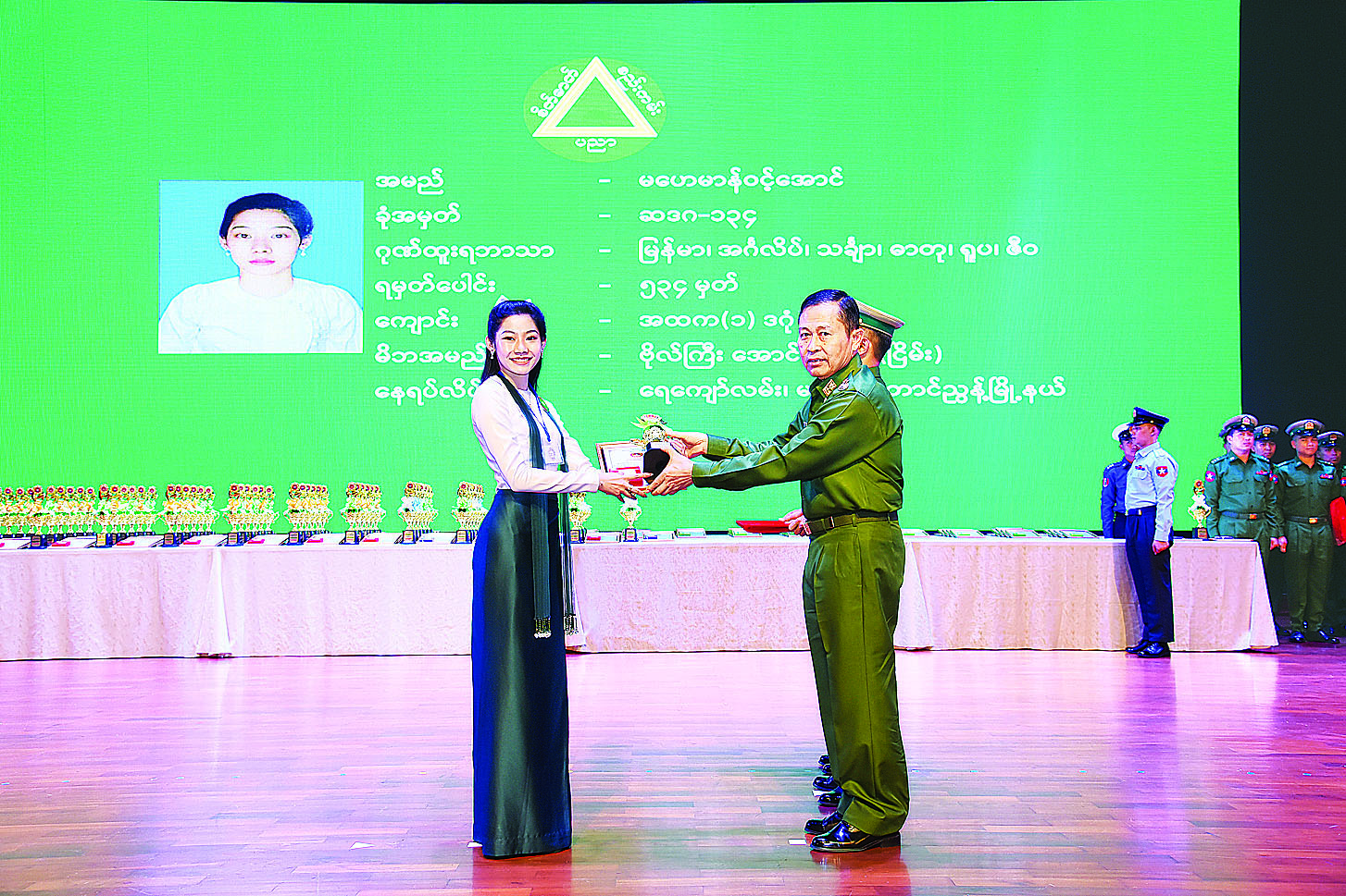 ထို့နောက် နိုင်ငံတော်စီမံအုပ်ချုပ်ရေးကောင်စီဥက္ကဋ္ဌ တပ်မတော်ကာကွယ်ရေးဦးစီးချုပ်၏ဇနီး ဒေါ်ကြူကြူလှက လူရည်ချွန်ဆုရရှိသူ ၅ ဦးနှင့် ၆ ဘာသာဂုဏ်ထူးဖြင့် ထူးချွန်စွာအောင်မြင်ခဲ့သူ ၅ ဦးတို့အား ဂုဏ်ပြုတံဆိပ်၊ ဂုဏ်ပြုဆုနှင့် ဂုဏ်ပြုမှတ်တမ်းလွှာများ ပေးအပ်ချီးမြှင့်သည်။