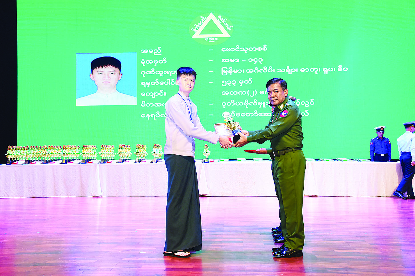 ဆက်လက်ပြီး နိုင်ငံတော်စီမံအုပ်ချုပ်ရေးကောင်စီဥက္ကဋ္ဌ တပ်မတော်ကာကွယ်ရေးဦးစီးချုပ်က လူရည်ချွန်ဆုရရှိသူ ၅ ဦးနှင့် ၆ ဘာသာဂုဏ်ထူးဖြင့် ထူးချွန်စွာ အောင်မြင်ခဲ့သူ ၂ ဦးတို့အား ဂုဏ်ပြုတံဆိပ်၊ ဂုဏ်ပြုဆုနှင့် ဂုဏ်ပြုမှတ်တမ်းလွှာများ ပေးအပ်ချီးမြှင့်သည်။