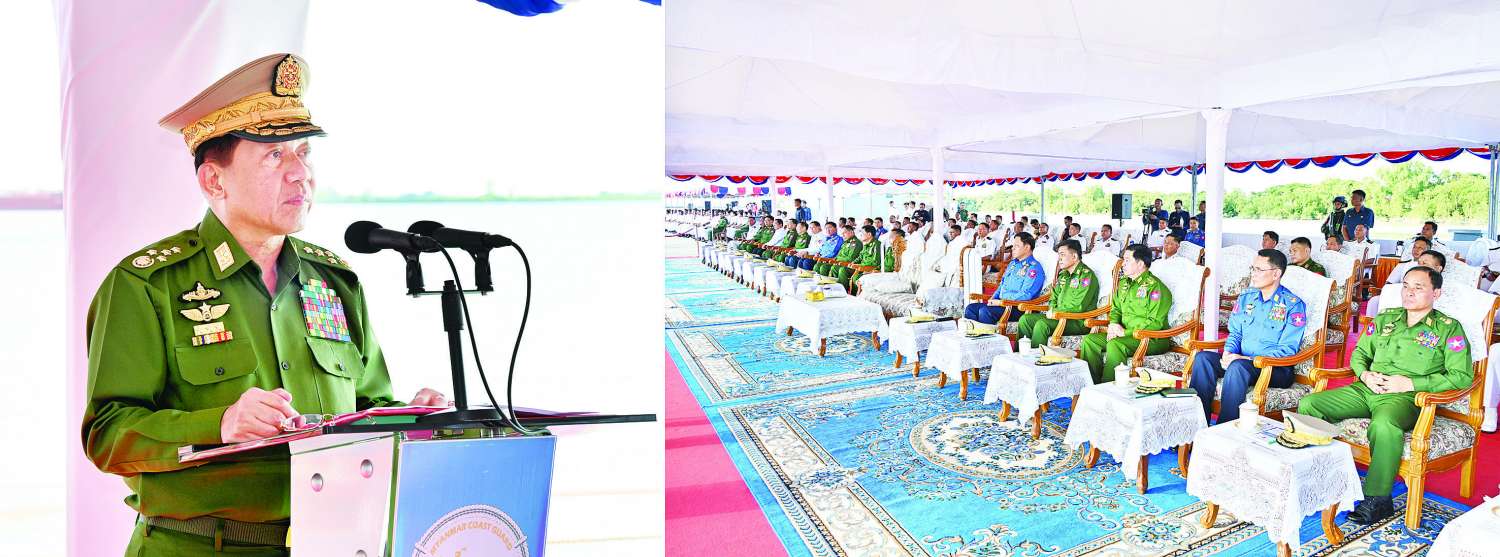 ပြည်ထောင်စုသမ္မတမြန်မာနိုင်ငံတော် ကမ်းခြေစောင့်တပ်ဖွဲ့ကွပ်ကဲမှုဌာနချုပ် တည်ထောင်ခြင်း(၃)နှစ်ပြည့် နှစ်ပတ်လည်နေ့အထိမ်းအမှတ်နှင့် ရေကြောင်းဆိုင်ရာအကျိုးစီးပွားများနှင့် မြန်မာ့ပင်လယ်ကမ်းရိုးတန်းလုံခြုံရေးအား ကာကွယ်စောင့်ရှောက်ရန်အတွက် ၄၈ မီတာ အမြန်သွားကင်းလှည့်ရေယာဉ်(၄)စီး တပ်တော်ဝင်ခြင်းအခမ်းအနားကို ယနေ့မွန်းလွဲပိုင်းတွင် အမှတ်(၃)ရေတပ်ဆိပ်ခံတံတား(သီလဝါ)၌ ကျင်းပပြုလုပ်ရာ နိုင်ငံတော်စီမံအုပ်ချုပ်ရေးကောင်စီဥက္ကဋ္ဌ တပ်မတော်ကာကွယ်ရေးဦးစီးချုပ် ဗိုလ်ချုပ်မှူးကြီးမင်းအောင်လှိုင် တက်ရောက်ဂုဏ်ပြုအမှာစကား ပြောကြားသည်။