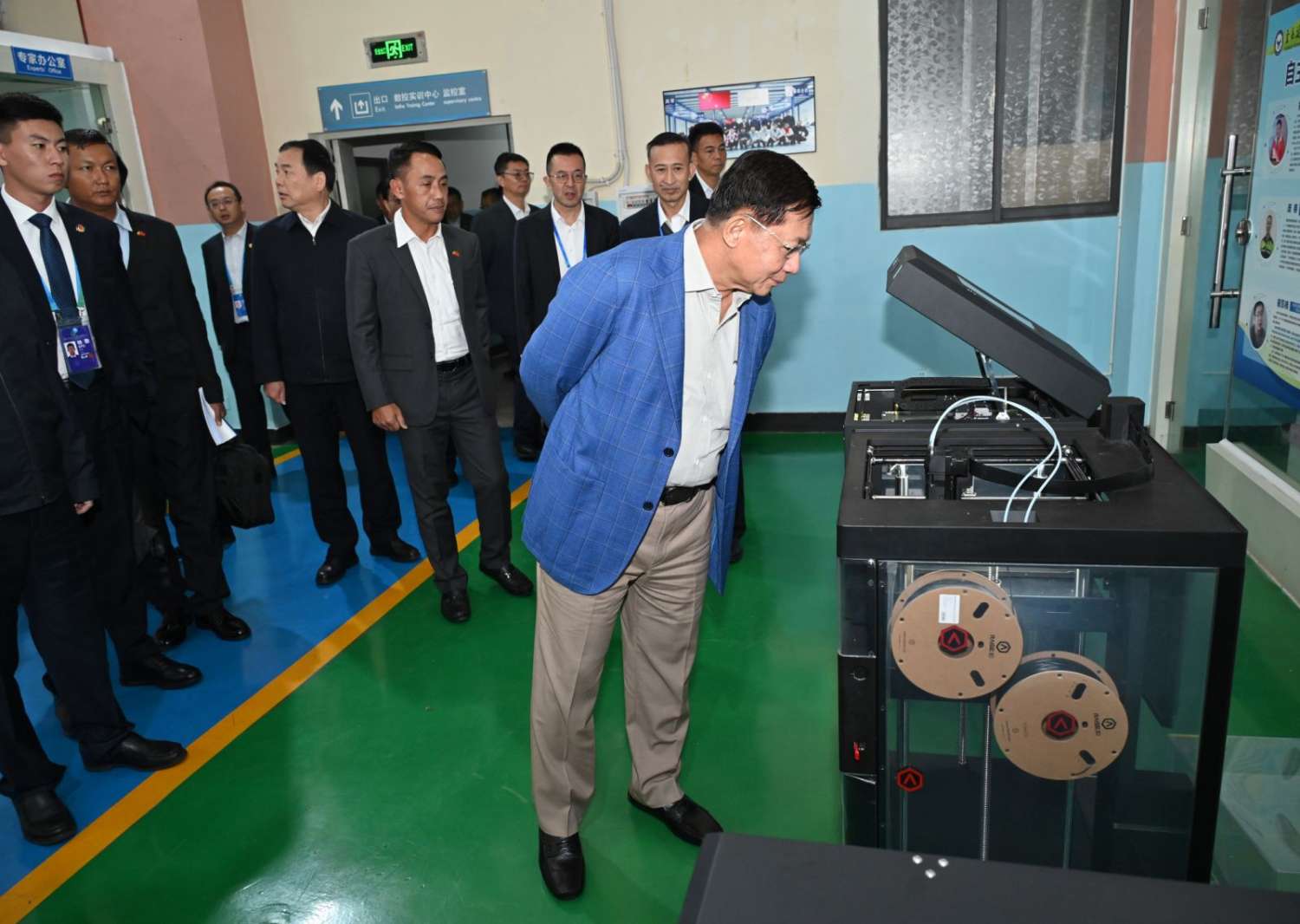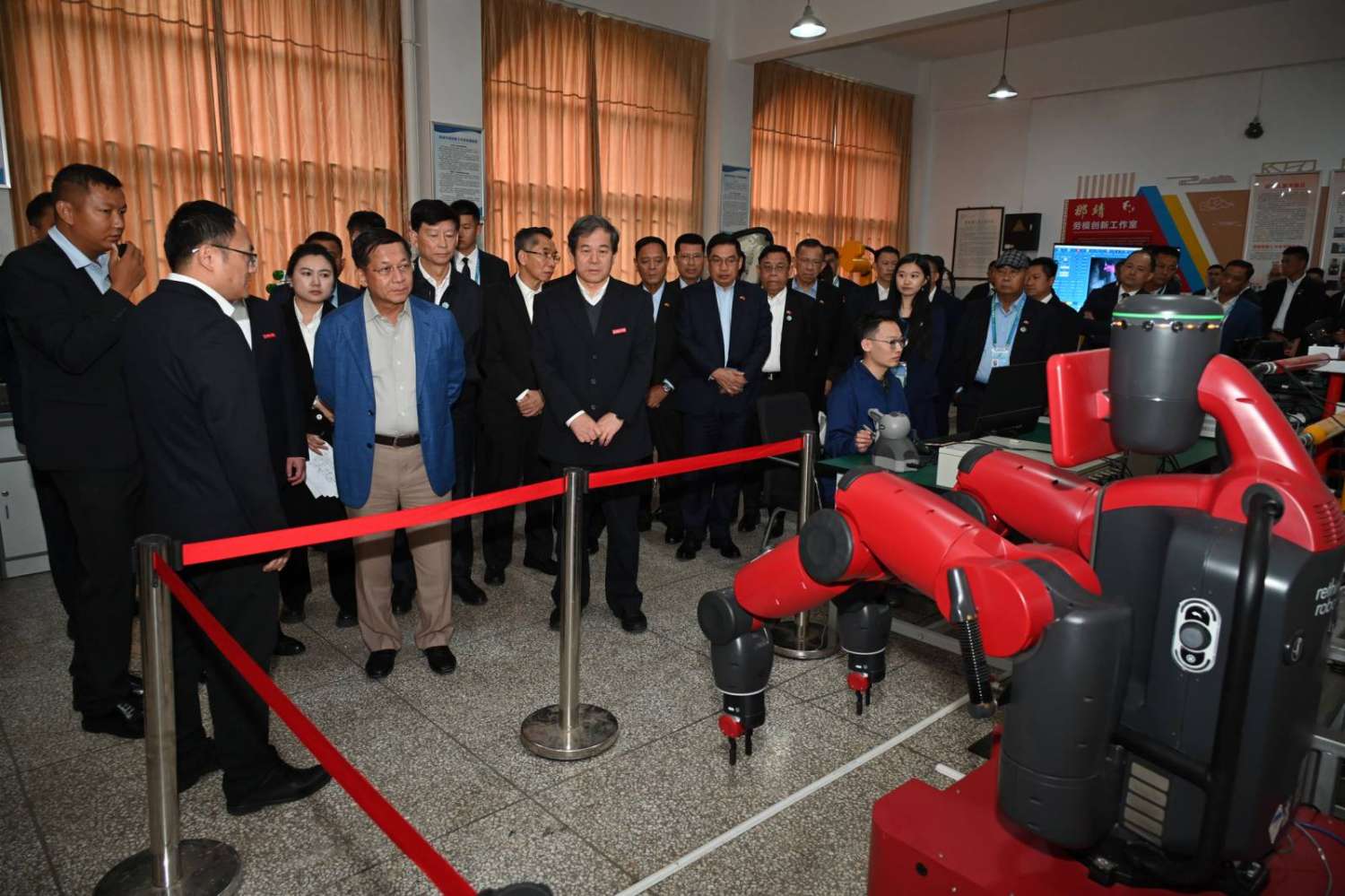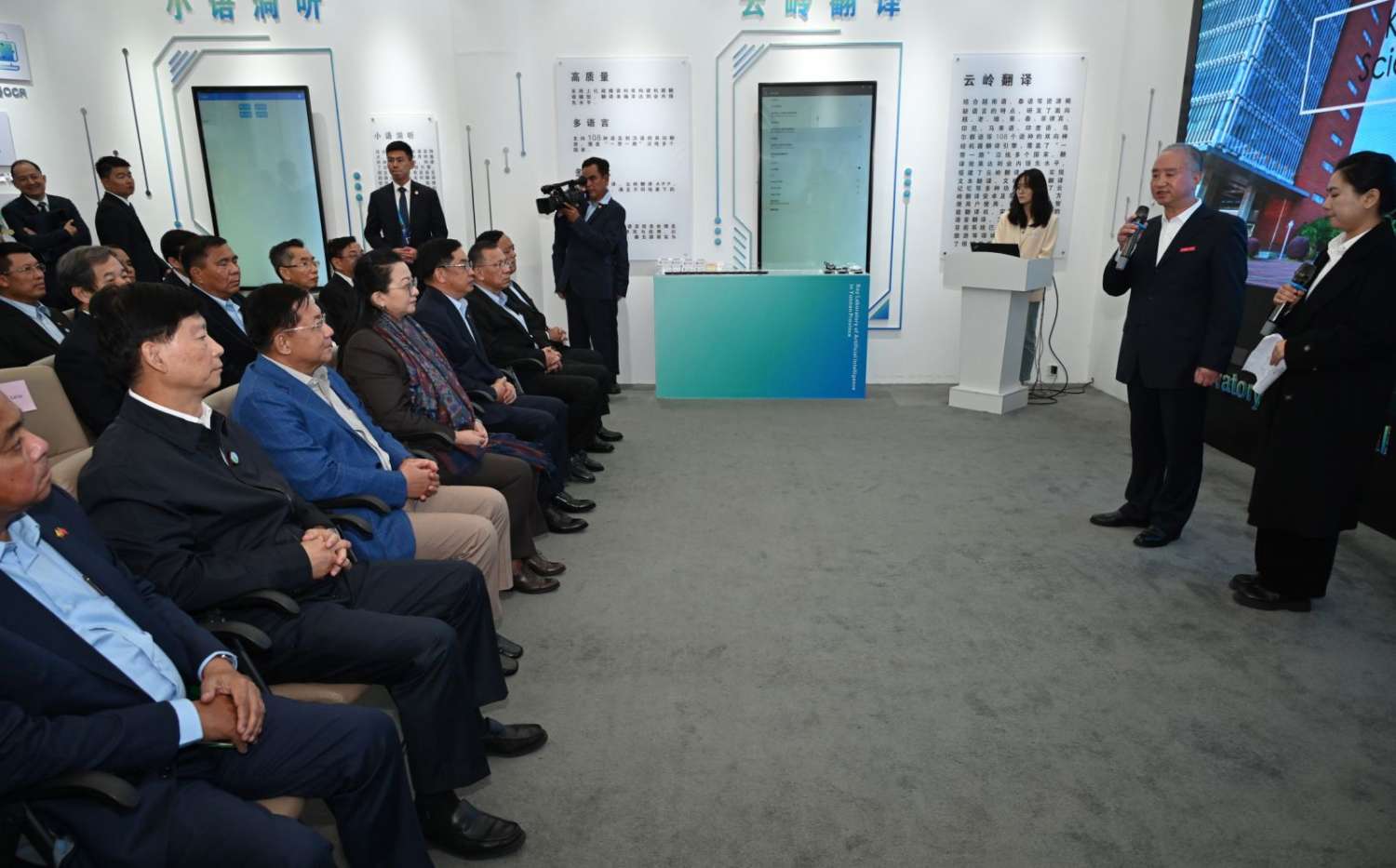ထိုမှတစ်ဆင့် နိုင်ငံတော်စီမံအုပ်ချုပ်ရေးကောင်စီဥက္ကဋ္ဌ နိုင်ငံတော်ဝန်ကြီးချုပ်နှင့် အဖွဲ့ဝင်များသည် ကူမင်းသိပ္ပံနှင့် နည်းပညာတက္ကသိုလ်သို့ရောက်ရှိကြရာ တက္ကသိုလ်ပါတီအတွင်းရေးမှူးဖြစ်သူ Mr. Teng Jiahua နှင့် တာဝန်ရှိသူများက ကြိုဆိုနှုတ်ဆက်ကြသည်။ ယင်းနောက် တက္ကသိုလ်ရှိ AI နည်းပညာစမ်းသပ်ခန်းအတွင်း၌ တက္ကသိုလ်ဆိုင်ရာ ဆောင်ရွက်ချက်များနှင့်ပတ်သက်၍ Video Clip ဖြင့် ဖွင့်လှစ်ရှင်းလင်းပြသသည်။ ထို့နောက် ဒုတိယပါမောက္ခချုပ်ဖြစ်သူ Mr. Liu Yanwen က AI နည်းပညာဆိုင်ရာဆောင်ရွက်ချက်များကို လက်တွေ့စမ်းသပ်ပြသသည်။