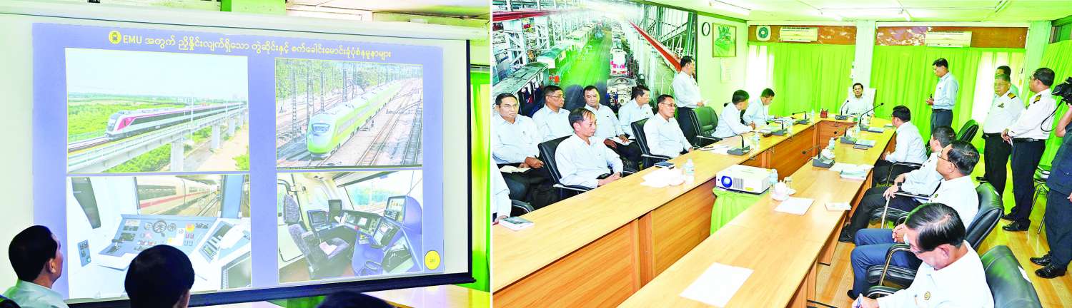 ထို့နောက် နိုင်ငံတော်စီမံအုပ်ချုပ်ရေးကောင်စီဥက္ကဋ္ဌ နိုင်ငံတော်ဝန်ကြီးချုပ်နှင့် အဖွဲ့ဝင်များသည် မြန်မာ့မီးရထား၊ စက်ခေါင်းစက်ရုံ (အင်းစိန်) သို့ရောက်ရှိကြရာ စက်ရုံအစည်းအဝေးခန်းမတွင် ကောင်စီဝင်၊ ပို့ဆောင်ရေးနှင့် ဆက်သွယ်ရေးဝန်ကြီးဌာန ပြည်ထောင်စုဝန်ကြီး ဗိုလ်ချုပ်ကြီး မြထွန်းဦးနှင့် မြန်မာ့မီးရထားမှ တာဝန်ရှိသူများက ရန်ကုန်မြို့ပတ်ရထားလမ်းပိုင်းအား လျှပ်စစ်ရထားပြေးဆွဲနိုင်ရေး ဆောင်ရွက်ရမည့်အခြေအနေများနှင့်ပတ်သက်၍ လျှပ်စစ်ဓာတ်အားရရှိနိုင်ရေး ဆောင်ရွက်မည့်အခြေအနေများနှင့် မြို့ပြအင်ဂျင်နီယာပိုင်းဆိုင်ရာ လုပ်ငန်းများ၊ အချက်ပြနှင့် ဆက်သွယ်ရေးဆိုင်ရာလုပ်ငန်းများ၊ လျှပ်စစ်ရထားတွဲဆိုင်း (Electric Multiple Unit) ရရှိရေး ဆောင်ရွက်ထားမှုအစီအစဉ်များ၊ RBE (Rail Bus Engine) များအား Battery Electric Multiple Unit (BEMU) အဖြစ် ပြောင်းလဲတည်ဆောက်ရန် ဆောင်ရွက်ထားမှု၊ EMU စနစ်၊ BEMU စနစ်တို့ကို ပြောင်းလဲပြေးဆွဲနိုင်မည့် အခြေအနေများနှင့်ပတ်သက်၍ သုံးသပ်တင်ပြချက်များ၊ ရန်ကုန်-မန္တလေး ရထားလမ်းပိုင်းတွင် လျှပ်စစ်ရထားများ ပြေးဆွဲနိုင်ရေးအတွက် ဆောင်ရွက်ရမည့် လုပ်ငန်းများနှင့်ပတ်သက်၍ လျှပ်စစ်ပိုင်းဆိုင်ရာလုပ်ငန်းများ၊ မြို့ပြအင်ဂျင်နီယာဆိုင်ရာလုပ်ငန်းများ၊ အချက်ပြနှင့် ဆက်သွယ်ရေးဆိုင်ရာလုပ်ငန်းများ၊ လျှပ်စစ်ရထားတွဲဆိုင်း (Electric Multiple Unit) နှင့် လျှပ်စစ်စက်ခေါင်း (Electric Locomotive) ရရှိရေး ဆောင်ရွက်ထားမှုအစီအစဉ်၊ ဒီဇယ်လျှပ်စစ်စက်ခေါင်းအား Battery Electric Locomotive အဖြစ် ပြောင်းလဲတည်ဆောက်ရန် ဆောင်ရွက်ထားမှု အစီအစဉ်များကို ရှင်းလင်းတင်ပြကြသည်။