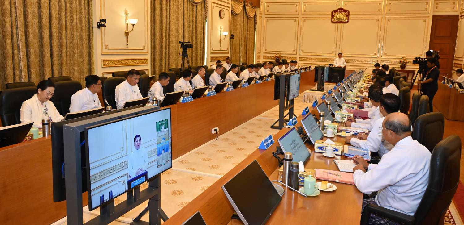 ပြည်ထောင်စုအစိုးရအဖွဲ့အစည်းအဝေးကို ယနေ့မွန်းလွဲပိုင်းတွင် နေပြည်တော်ရှိ နိုင်ငံတော်စီမံအုပ်ချုပ်ရေးကောင်စီဥက္ကဋ္ဌရုံး အစည်းအဝေးခန်းမ၌ ကျင်းပရာ နိုင်ငံတော်စီမံအုပ်ချုပ်ရေးကောင်စီဥက္ကဋ္ဌ နိုင်ငံတော်ဝန်ကြီးချုပ် ဗိုလ်ချုပ်မှူးကြီး မင်းအောင်လှိုင် တက်ရောက်အမှာစကားပြောကြားသည်။