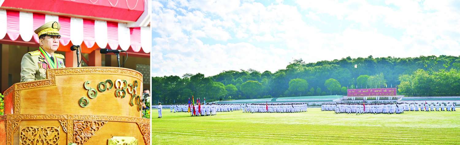 စစ်တက္ကသိုလ် ဗိုလ်လောင်းသင်တန်းအမှတ်စဉ်(၆၆) သင်တန်းဆင်းဂုဏ်ပြု စစ်ရေးပြအခမ်းအနားကို ယနေ့နံနက်ပိုင်းတွင် ပြင်ဦးလွင်မြို့၊ စစ်တက္ကသိုလ်စစ်ရေးပြကွင်း၌ ကျင်းပပြုလုပ်ရာ နိုင်ငံတော်စီမံအုပ်ချုပ်ရေးကောင်စီဥက္ကဋ္ဌ တပ်မတော်ကာကွယ်ရေးဦးစီးချုပ် ဗိုလ်ချုပ်မှူးကြီး သတိုးမဟာသရေစည်သူ သတိုးသီရိသုဓမ္မ မင်းအောင်လှိုင် တက်ရောက်မိန့်ခွန်း ပြောကြားသည်။