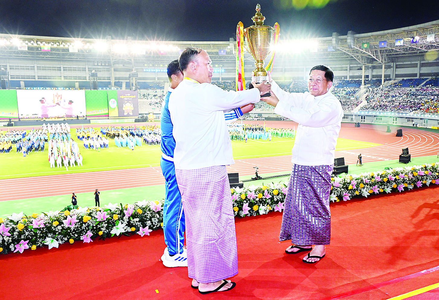 ၂ဝ၂၄ ခုနှစ်၊ ပဉ္စမအကြိမ်မြောက် အမျိုးသားအားကစားပွဲတော် ပိတ်ပွဲအခမ်းအနားကို ယနေ့ညနေပိုင်းတွင် နေပြည်တော်ရှိ ဝဏ္ဏသိဒ္ဓိအားကစားကွင်း၌ ကျင်းပပြုလုပ်ရာ နိုင်ငံတော်စီမံအုပ်ချုပ်ရေးကောင်စီဥက္ကဋ္ဌ နိုင်ငံတော်ဝန်ကြီးချုပ် ဗိုလ်ချုပ်မှူးကြီး မင်းအောင်လှိုင် တက်ရောက်ချီးမြှင့်ပြီး ဂုဏ်ပြုအမှာစကားပြောကြားသည်။