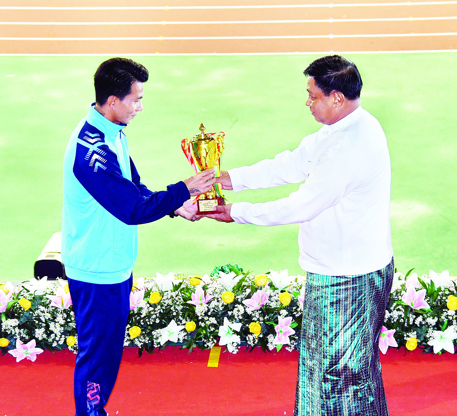 ဆက်လက်၍ နိုင်ငံတော်စီမံအုပ်ချုပ်ရေးကောင်စီဥက္ကဋ္ဌ နိုင်ငံတော်ဝန်ကြီးချုပ် ဗိုလ်ချုပ်မှူးကြီး မင်းအောင်လှိုင်က ပြည်နယ်နှင့်တိုင်းဒေသကြီးအဆင့် မသန်စွမ်းအားကစားပြိုင်ပွဲတွင် တံခွန်စိုက်ဆုဖလားရရှိသော ဧရာဝတီတိုင်းဒေသကြီးကို တံခွန်စိုက်ဆုဖလားကြီးကိုလည်းကောင်း၊ ပြည်နယ်နှင့်တိုင်းဒေသကြီးအဆင့် အားကစားပြိုင်ပွဲတွင် တံခွန်စိုက်ဆုဖလားရရှိသော ရန်ကုန်တိုင်းဒေသကြီးကို တံခွန်စိုက်ဆုဖလားကြီးကိုလည်းကောင်း၊ ဝန်ကြီးဌာနအဆင့် အားကစားပြိုင်ပွဲတွင် တံခွန်စိုက်ဆုဖလားရရှိသော ကာကွယ်ရေးဝန်ကြီးဌာနကို တံခွန်စိုက်ဆုဖလားကြီးကိုလည်းကောင်း ပေးအပ်ချီးမြှင့်သည်။