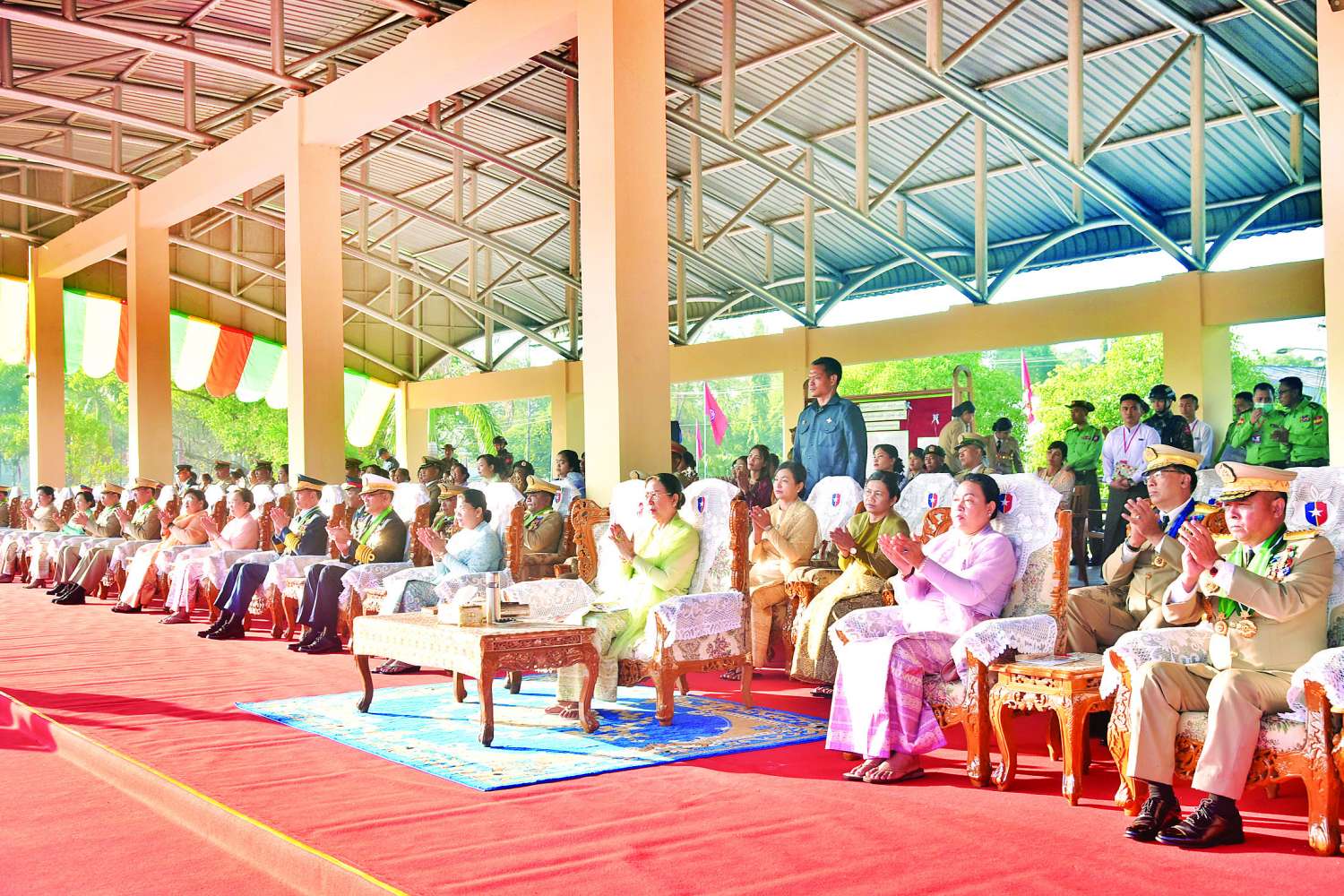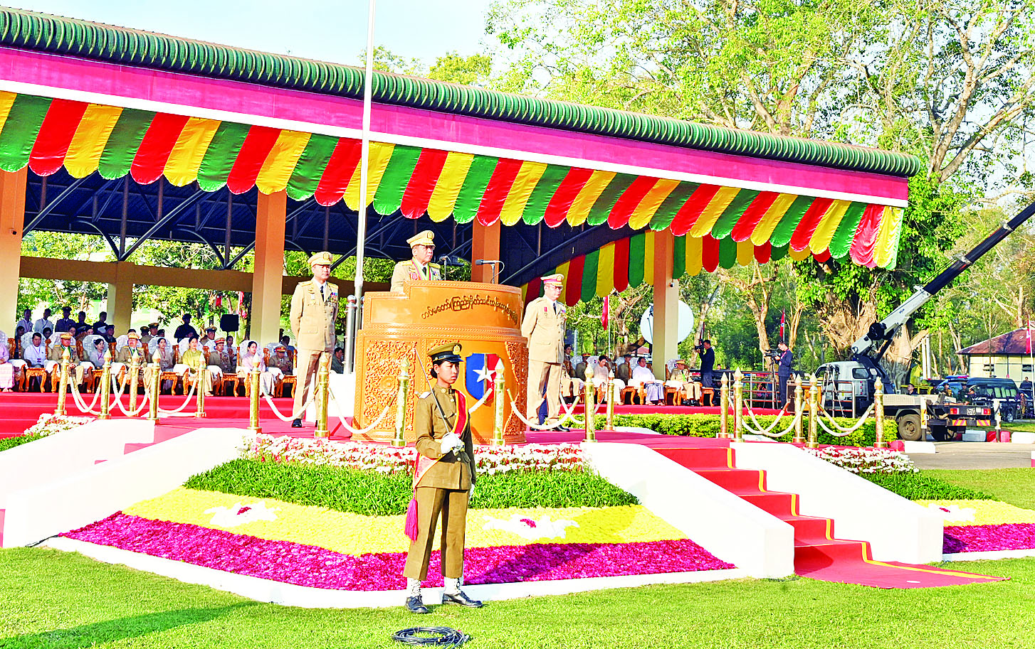 တပ်မတော်၏ အမျိုးသမီးစစ်မှုထမ်းများ၏ အခန်းကဏ္ဍကို အားသစ်လောင်းမည့် ဘွဲ့ရအမျိုးသမီးဗိုလ်လောင်းသင်တန်း အမှတ်စဉ်(၁၁) သင်တန်းဆင်းဂုဏ်ပြုစစ်ရေးပြအခမ်းအနားကို ယနေ့နံနက်ပိုင်းတွင် ရန်ကုန်မြို့ရှိ တပ်မတော်(ကြည်း) ဗိုလ်သင်တန်းကျောင်း(မှော်ဘီ) စစ်ရေးပြကွင်း၌ ကျင်းပပြုလုပ်ရာ နိုင်ငံတော်စီမံအုပ်ချုပ်ရေးကောင်စီဥက္ကဋ္ဌ တပ်မတော်ကာကွယ်ရေးဦးစီးချုပ် ဗိုလ်ချုပ်မှူးကြီးသတိုးမဟာသရေစည်သူ သတိုးသီရိသုဓမ္မ မင်းအောင်လှိုင် တက်ရောက်မိန့်ခွန်း ပြောကြားသည်။ အဆိုပါအခမ်းအနားသို့ နိုင်ငံတော်စီမံအုပ်ချုပ်ရေးကောင်စီဥက္ကဋ္ဌ တပ်မတော်ကာကွယ်ရေးဦးစီးချုပ်နှင့်အတူ ဇနီးဒေါ်ကြူကြူလှ၊ ကာကွယ်ရေးဦးစီးချုပ်(ရေ) ဗိုလ်ချုပ်ကြီး ဇေယျကျော်ထင် ထိန်ဝင်းနှင့်ဇနီး၊ ကာကွယ်ရေးဦးစီးချုပ်(လေ) ဗိုလ်ချုပ်ကြီး ဇေယျကျော်ထင် စည်သူထွန်းအောင်နှင့်ဇနီး၊ ကာကွယ်ရေးဦးစီးချုပ်ရုံးမှ အဆင့်မြင့်တပ်မတော်အရာရှိကြီးများနှင့် ဇနီးများ၊ ပြည်ထောင်စုဝန်ကြီးများနှင့် ဇနီးများ၊ ရန်ကုန်တိုင်းဒေသကြီးဝန်ကြီးချုပ်နှင့် ဇနီး၊ ရန်ကုန်တိုင်းစစ်ဌာနချုပ်တိုင်းမှူး၊ တပ်မတော်(ကြည်း) ဗိုလ်သင်တန်းကျောင်း(မှော်ဘီ) ကျောင်းအုပ်ကြီးနှင့် မှော်ဘီတပ်နယ်မှ တာဝန်ရှိသူများ၊ ကျောင်းဆင်းဗိုလ်လောင်းများ၏ မိဘဆွေမျိုးများနှင့် ဖိတ်ကြားထားသည့် ဧည့်သည့်တော်များတက်ရောက်ကြသည်။