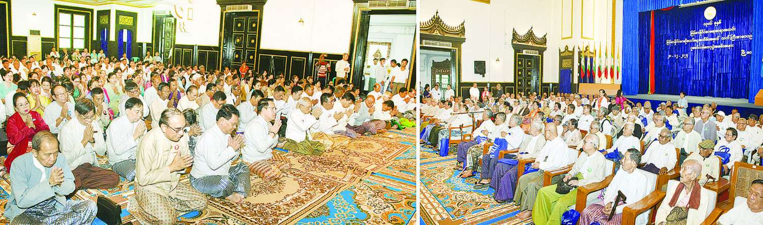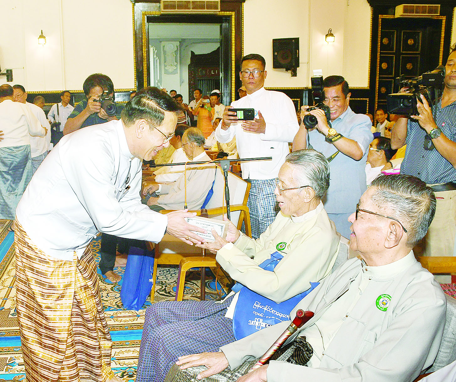 ထို့နောက် ကန်တော့ခံသက်ကြီး စာပေပညာရှင်ကြီးများအား ပြည်ထောင်စုဝန်ကြီးနှင့် အခမ်းအနားသို့တက်ရောက်လာကြသူများက ကန်တော့ချိုးဖြင့် လက်အုပ်ချီမိုးကန်တော့ကြပြီး ပစ္စည်းနှင့်ငွေများပေးအပ်လှူဒါန်းကြသည်။