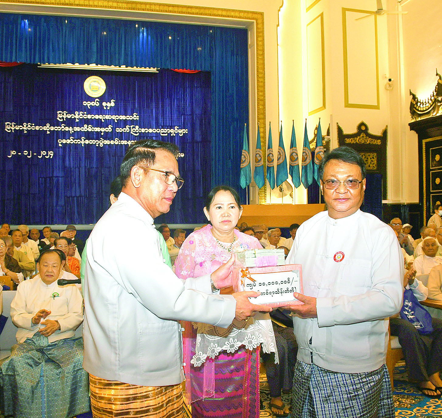ထို့နောက် ပြန်ကြားရေးဝန်ကြီးဌာနမှ လှူဒါန်းသည့် ငွေကျပ် ၂၅ သိန်းအား ပုံနှိပ်ရေးနှင့်ထုတ်ဝေရေးဦးစီးဌာန ညွှန်ကြားရေးမှူးချုပ်ကလည်းကောင်း၊ ရန်ကုန်တိုင်းဒေသကြီးအစိုးရအဖွဲ့မှလှူဒါန်းသည့် ငွေကျပ် ၂၇၆ သိန်း အား ရန်ကုန်တိုင်းဒေသကြီး လူမှုရေးရာဝန်ကြီးကလည်းကောင်း၊ ရန်ကုန်မြို့တော်စည်ပင်သာယာရေးကော်မတီမှ လှူဒါန်းသည့် ငွေကျပ်သိန်း ၃၀ အား ရန်ကုန် မြို့တော် စည်ပင်သာယာရေးကော်မတီမှ တာဝန်ရှိသူကလည်းကောင်း၊ ပြည်ထောင်စုကြံ့ခိုင်ရေးနှင့် ဖွံ့ဖြိုးရေးပါတီဌာနချုပ်မှလှူဒါန်းသည့် ငွေကျပ် ၁၀ သိန်းအား ဦးပိုက်ထွေးကလည်းကောင်း၊ ရန်ကုန်တိုင်းဒေသကြီး ပြည်ထောင်စုကြံ့ခိုင်ရေးနှင့်ဖွံ့ဖြိုးရေးပါတီမှလှူဒါန်းသည့် ငွေကျပ် ၅ သိန်းအား ဦးခင်မောင်စိုးကလည်းကောင်း ပေးအပ်လှူဒါန်းရာ မြန်မာနိုင်ငံစာရေးဆရာအသင်းဥက္ကဋ္ဌက လက်ခံရယူပြီး ဂုဏ်ပြုမှတ်တမ်းလွှာများ ပြန်လည်ပေးအပ်သည်။
