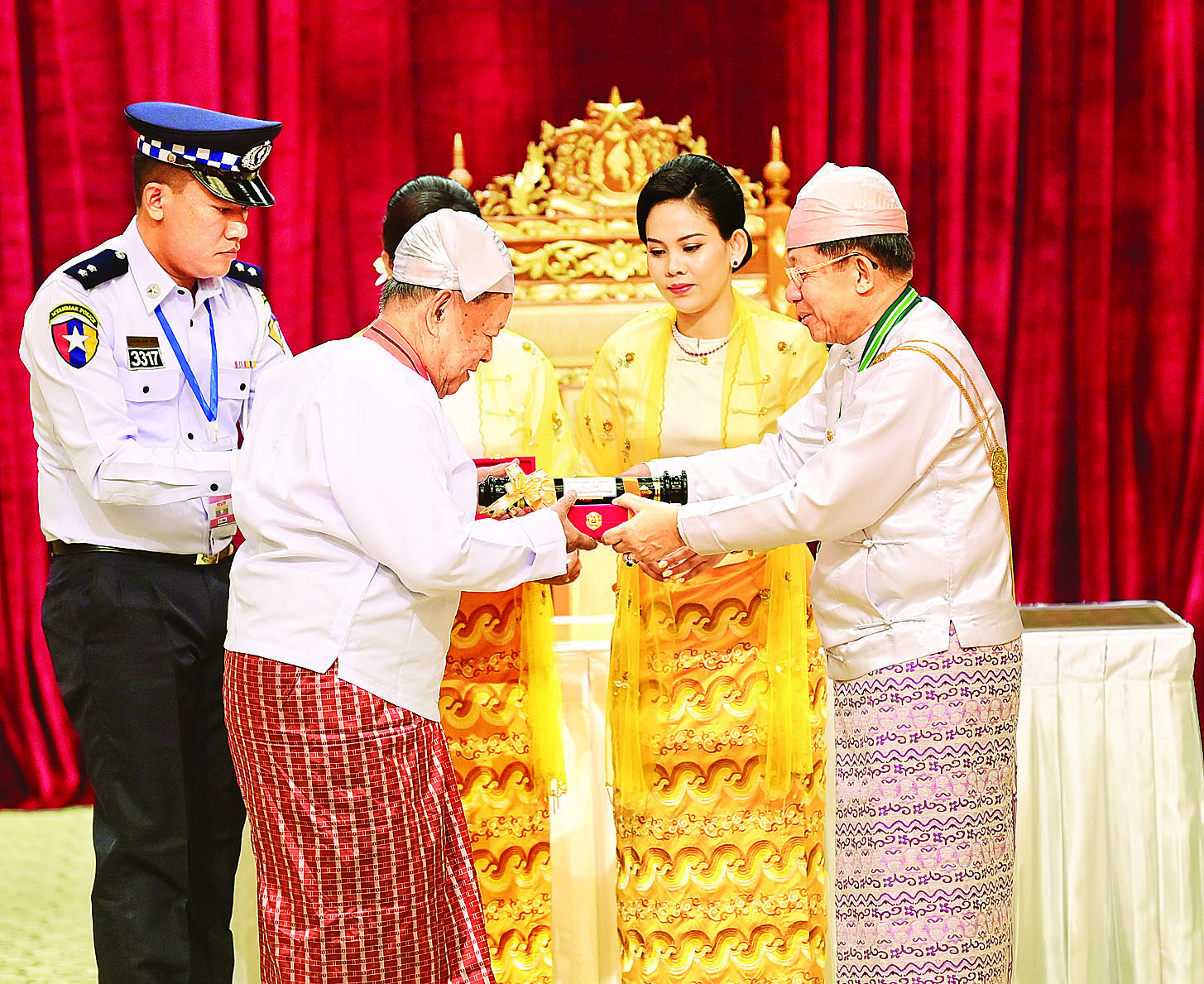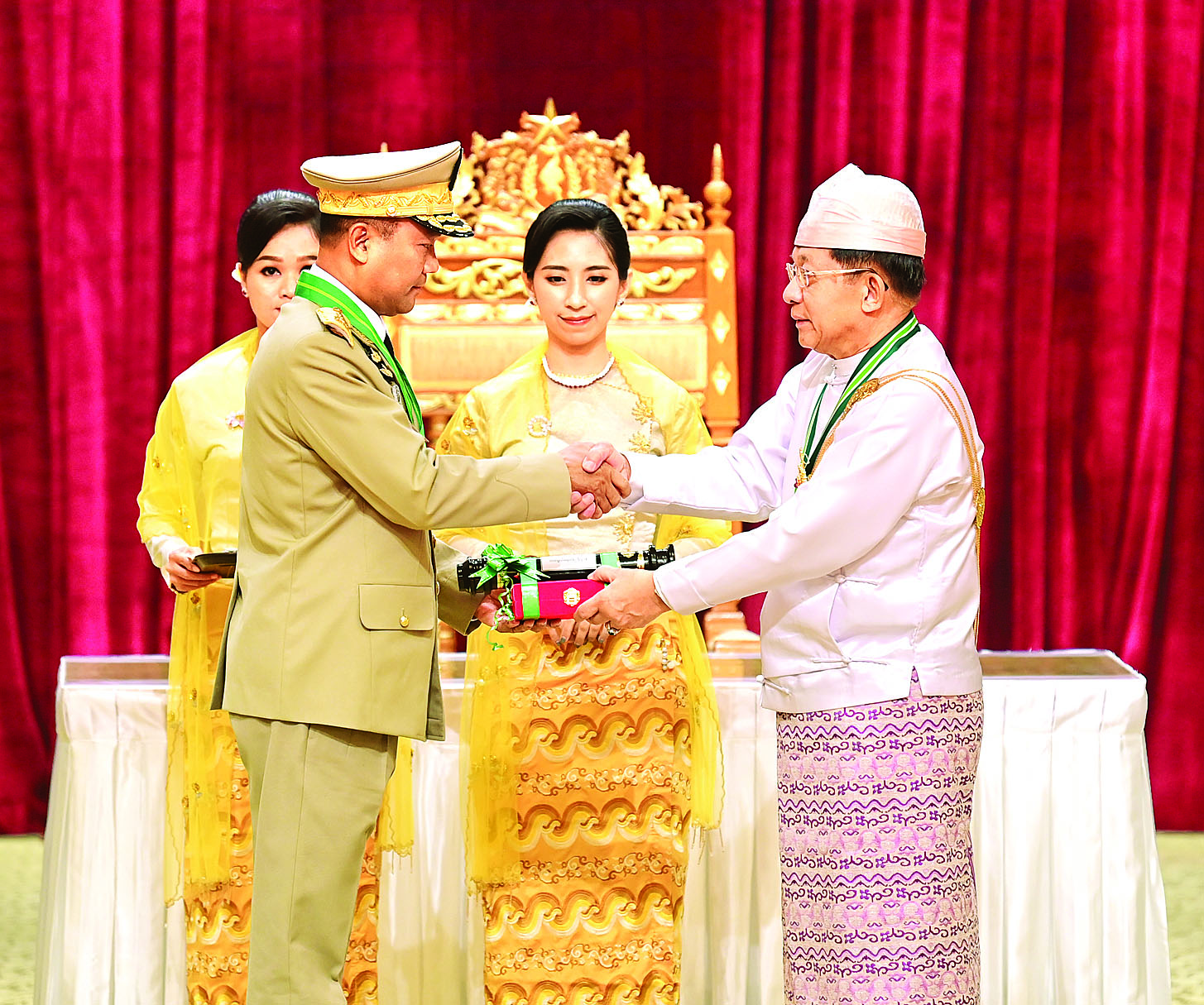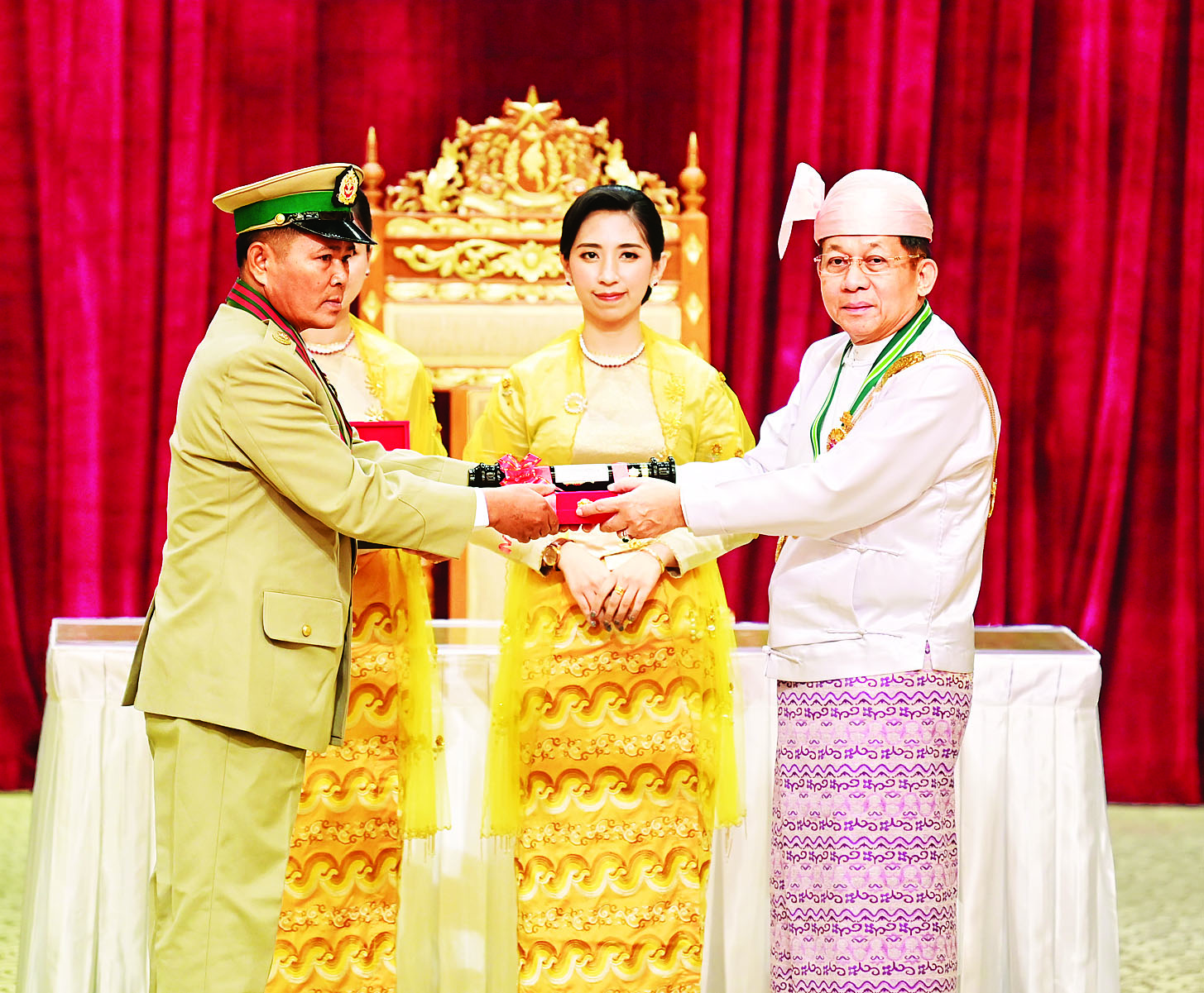 နိုင်ငံတော်စီမံအုပ်ချုပ်ရေးကောင်စီဥက္ကဋ္ဌ နိုင်ငံတော်ဝန်ကြီးချုပ် ဗိုလ်ချုပ်မှူးကြီး သတိုးမဟာသရေစည်သူ သတိုးသီရိသုဓမ္မ မင်းအောင်လှိုင် (၇၇)နှစ်မြောက်လွတ်လပ်ရေးနေ့အထိမ်းအမှတ် ဂုဏ်ထူးဆောင်ဘွဲ့များ ချီးမြှင့်အပ်နှင်းခြင်းအခမ်းအနားသို့ တက်ရောက်ချီးမြှင့်