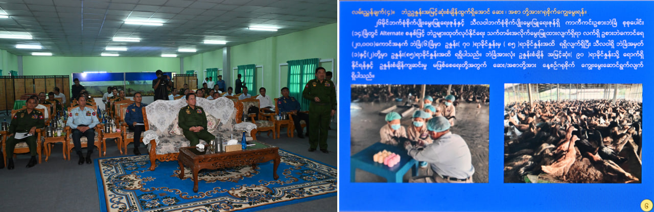 ထို့နောက် နိုင်ငံတော်စီမံအုပ်ချုပ်ရေးကောင်စီဥက္ကဋ္ဌ တပ်မတော်ကာကွယ်ရေးဦးစီးချုပ်နှင့် အဖွဲ့ဝင်များသည် သီလဝါဘက်စုံစိုက်ပျိုးမွေးမြူရေးဇုန်တွင် မွေးမြူထားရှိသည့် ငါး အမျိုးအစားနမူနာပြသထားရှိမှုများနှင့် စိုက်ပျိုးမွေးမြူရေးလုပ်ငန်းများမှ ထွက်ရှိသည့် ကြက်ဥ၊ ဘဲဥ၊ နို့ထွက်ပစ္စည်းများ ခင်းကျင်းပြသထားမှုများကို ကြည့်ရှုသည်။