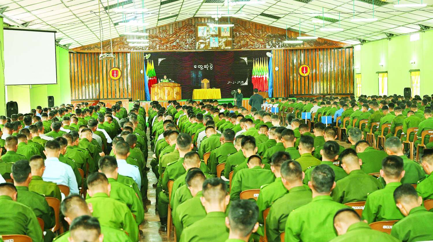 တပ်မတော်ပိုင်းနှင့်ပတ်သက်၍ တပ်မတော်သားများသည် မည်သူတစ်ဦးတစ်ယောက်၏ တိုက်တွန်းချက်မျှမပါရှိဘဲ နိုင်ငံတော်ကာကွယ်ရေးနှင့် လုံခြုံရေးတာဝန်များကို ထမ်းဆောင်မည်ဟူသည့် မွန်မြတ်သည့်စိတ်ဓာတ်များဖြင့် တပ်မတော်အတွင်းသို့ ဝင်ရောက်ခဲ့ကြသူများပင်ဖြစ်ကြောင်း၊ ထိုကဲ့သို့သော အခြေခံစိတ်ဓာတ်ကောင်းများကို ဆက်လက်ထိန်းသိမ်းပြီး နိုင်ငံတော်နှင့် တပ်မတော်မှပေးအပ်လာသောတာဝန်များကို ဂုဏ်ယူစွာဖြင့် ဆက်လက်ထမ်းဆောင်သွားကြရမည်ဖြစ်ကြောင်း၊ တာဝန်များကိုထမ်းဆောင်ရာ၌ မိမိတို့အား ပေးအပ်လာသည့်တာဝန်များကို စွမ်းရည်သတ္တိအပြည့်ဖြင့် အောင်မြင်အောင်ထမ်းဆောင်ကြရန်လိုပြီး စိတ်ပိုင်း၊ ရုပ်ပိုင်းဆိုင်ရာအရ ကျန်းမာကြံ့ခိုင်မှုရှိရန်၊ ဇွဲ၊ လုံ့လ၊ ဝီရိယအပြည့်ဖြင့် တာဝန်ထမ်းဆောင်ကြရန်လိုကြောင်း၊ ယခုကဲ့သို့ သင်တန်းများမှ သင်ကြားပို့ချပေးသည့် စစ်နည်းဗျူဟာများ၊ စစ်အခြေခံသဘောတရားများကိုအမှန်တကယ် သိရှိနားလည် တတ်ကျွမ်းမှုရှိအောင်သင်ယူ လေ့လာသွားကြရန်လိုပြီး လက်တွေ့စစ်မြေပြင်တွင် အကျိုးရှိရှိအသုံးချနိုင်ရမည်ဖြစ်ကြောင်း၊ စိတ်ဓာတ်ကြံ့ခိုင်မှုရှိပါက လုပ်ငန်းများကို ရာနှုန်းပြည့်အောင်မြင်အောင် ထမ်းဆောင်နိုင်မည်ဖြစ်ပြီး တစ်ဦးချင်းစိတ်ဓာတ်ခိုင်မာမှုရှိစေရေး၊ ကြံ့ခိုင်မှုရှိစေရေး ယုံကြည်ချက်၊ ခံယူချက်ကောင်းစွာဖြင့် နိုင်ငံတော်ကာကွယ်ရေးတာဝန်များကို ထမ်းဆောင်သွားကြရန်လိုကြောင်း၊ သင်တန်းသားအရာရှိများအနေဖြင့် တစ်ဦးချင်းစီအလိုက် ရည်မှန်းချက်များ ကိုယ်စီရှိကြမည်ဖြစ်ပြီး မိမိတို့၏ ရည်မှန်းချက်များ အောင်မြင်မှုရှိစေရေး၊ မပျောက်ပျက်စေရေး မလျှော့သောဇွဲ၊ လုံ့လများဖြင့် ဆက်လက်ကြိုးပမ်း ဆောင်ရွက်သွားကြရန်လိုကြောင်း၊ ယနေ့ခေတ်သည် နည်းပညာခေတ်ဖြစ်သဖြင့် ပြောင်းလဲတိုးတက်နေသည့် နည်းပညာရပ်များ၊ စစ်နည်းဗျူဟာများကို မျက်ခြည်မပြတ်သိရှိနေစေရေး စဉ်ဆက်မပြတ်သည့် လေ့လာဆည်းပူးမှုများကို ဆောင်ရွက်သွားကြရမည်ဖြစ်ကြောင်း၊ ခိုင်မာတည်ကြည်သည့် စိတ်ဓာတ်များဖြင့် မိမိကိုယ်ကိုထိန်းသိမ်း၍ ရည်မှန်းချက်များ အောင်မြင်မှုရရှိအောင် ဆက်လက်ဆောင်ရွက်သွားကြ ရန်လိုကြောင်း။