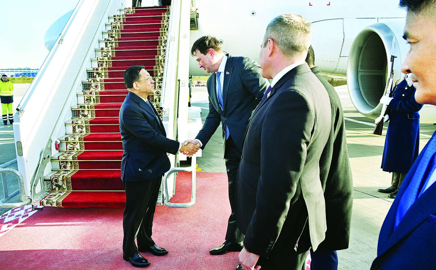 ယင်းနောက် နိုင်ငံတော်စီမံအုပ်ချုပ်ရေးကောင်စီဥက္ကဋ္ဌ နိုင်ငံတော်ဝန်ကြီးချုပ် ဦးဆောင်သည့် ချစ်ကြည်ရေးကိုယ်စားလှယ်အဖွဲ့သည် ဘီလာရုစ်နိုင်ငံ မင့်စ်မြို့ အပြည်ပြည်ဆိုင်ရာလေဆိပ်သို့ ရောက်ရှိကြရာ ဘီလာရုစ်နိုင်ငံ နိုင်ငံခြားရေးဝန်ကြီး H. E. Mr. Maxim Ryzhenkov ၊ မြန်မာနိုင်ငံဆိုင်ရာ ဘီလာရုစ်သံအမတ်ကြီး၊ မြန်မာကောင်စစ်ဝန်ချုပ် ဦးမိုးကျော်သူနှင့် တာဝန်ရှိသူများက လေဆိပ်၌ ကြိုဆိုနှုတ်ဆက်ကြသည်။