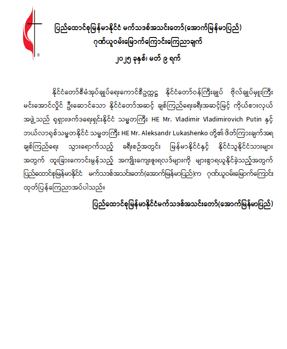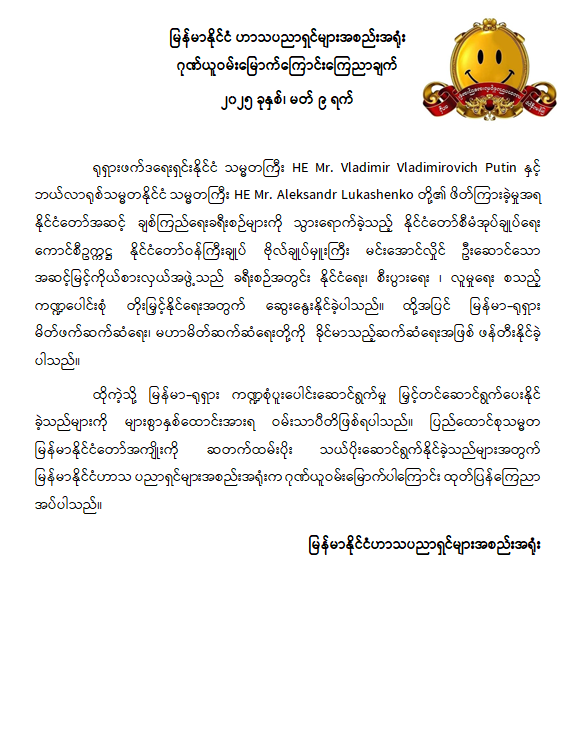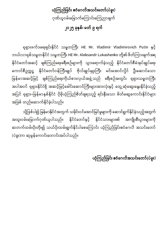 နိုင်ငံတော်စီမံအုပ်ချုပ်ရေးကောင်စီဥက္ကဋ္ဌ နိုင်ငံတော်ဝန်ကြီးချုပ် ဗိုလ်ချုပ်မှူးကြီး မင်းအောင်လှိုင်၏ ရုရှားဖက်ဒရေးရှင်းနိုင်ငံနှင့် ဘယ်လာရုစ်သမ္မတနိုင်ငံများသို့ သွားရောက်သည့် ချစ်ကြည်ရေးခရီးစဉ်များတွင် နိုင်ငံတော်အတွက် ကဏ္ဍစုံဖွံ့ဖြိုးတိုးတက်အောင် ကြိုးပမ်းဆောင်ရွက်ခဲ့မှုအပေါ် အဖွဲ့အစည်းများမှ ဂုဏ်ယူဝမ်းမြောက်ကြောင်း ထုတ်ပြန်ကြေညာ