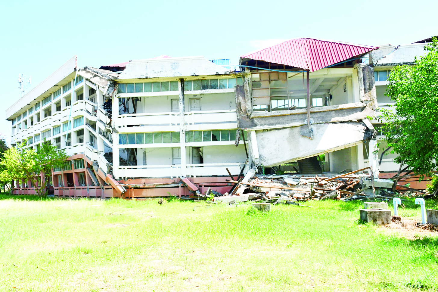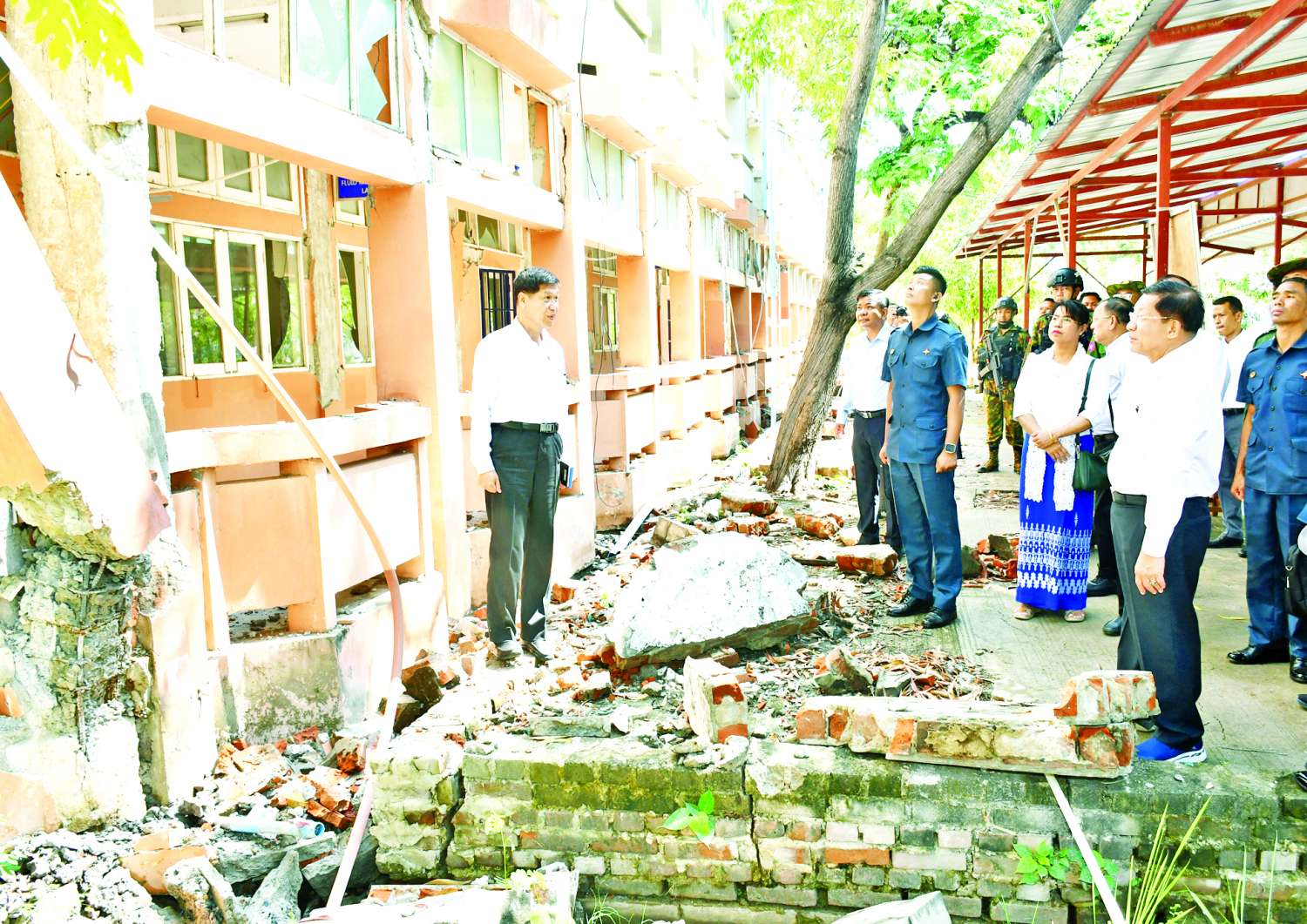 ၎င်းနောက် နိုင်ငံတော်စီမံ အုပ်ချုပ်ရေးကောင်စီဥက္ကဋ္ဌ နိုင်ငံတော်ဝန်ကြီးချုပ်နှင့် အဖွဲ့ဝင်များသည် ငလျင်ဒဏ်ကြောင့် ပြိုကျပျက်စီးသွားသော စာသင်ဆောင်များ၊ အားကစားခန်းမနေရာ၊ ကျောင်းသားအိပ်ဆောင်နှင့် ဝန်ထမ်းအိမ်ရာများအား သွားရောက်ကြည့်ရှုစစ်ဆေးပြီး တာဝန်ရှိသူများ၏ တင်ပြချက်များအပေါ် အဆောက်အအုံအပျက်အစီးများ ရှင်းလင်းဖယ်ရှား၍ အမြန်ဆုံးပြန်လည်ပြုပြင်နိုင်ရေး၊ ကျောင်းအမြန်ဆုံး ပြန်လည်ဖွင့်လှစ်နိုင်ရေးတို့ကို မှာကြားပြီး လိုအပ်သည်များဖြည့်ဆည်းဆောင်ရွက်ပေးသည်။