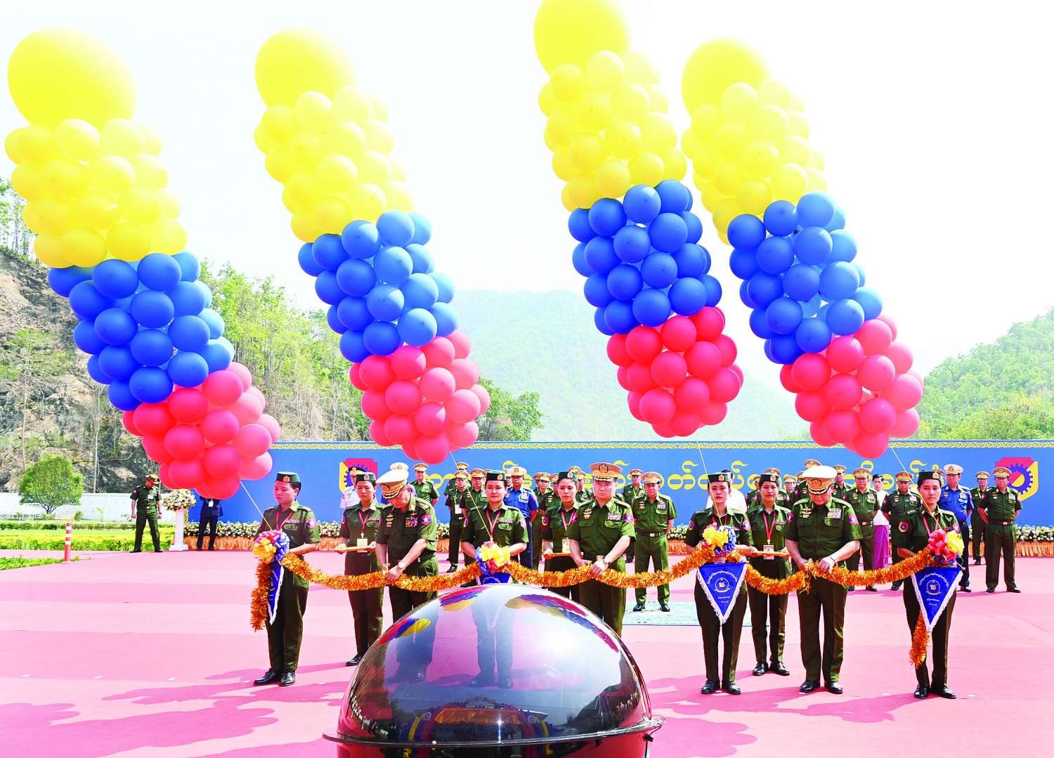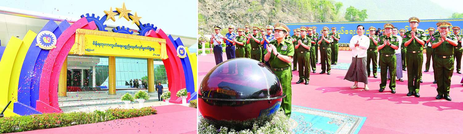 ဦးစွာ ညှိနှိုင်းကွပ်ကဲရေးမှူး (ကြည်း၊ ရေ၊ လေ) ဗိုလ်ချုပ်ကြီး ကျော်စွာလင်း၊ ကာကွယ်ရေးဦးစီး ချုပ်ရုံး(ကြည်း)မှ ဒုတိယဗိုလ်ချုပ်ကြီး တေဇကျော်နှင့် ကာကွယ်ရေးပစ္စည်းထုတ်လုပ်ရေးအရာရှိချုပ် ဒုတိယဗိုလ်ချုပ်ကြီး ကံမြင့်သန်းတို့က (၇၅)နှစ်မြောက် စိန်ရတု ကာကွယ်ရေးပစ္စည်းထုတ်လုပ်မှုတပ်ဖွဲ့နေ့ အခမ်းအနားကို ဖဲကြိုးဖြတ်ဖွင့်လှစ်ပေးပြီး နိုင်ငံတော်စီမံအုပ်ချုပ်ရေးကောင်စီဥက္ကဋ္ဌ တပ်မတော်ကာကွယ်ရေးဦးစီးချုပ်က (၇၅)နှစ်မြောက် စိန်ရတုကာကွယ်ရေးပစ္စည်းထုတ်လုပ်မှုတပ်ဖွဲ့နေ့ ဆိုင်းဘုတ်ကို စက်ခလုတ်နှိပ် ဖွင့်လှစ်ပေးသည်။ ယင်းနောက် တက်ရောက်လာကြသူများနှင့်အတူ စုပေါင်းမှတ်တမ်းတင်ဓာတ်ပုံရိုက်ကြသည်။