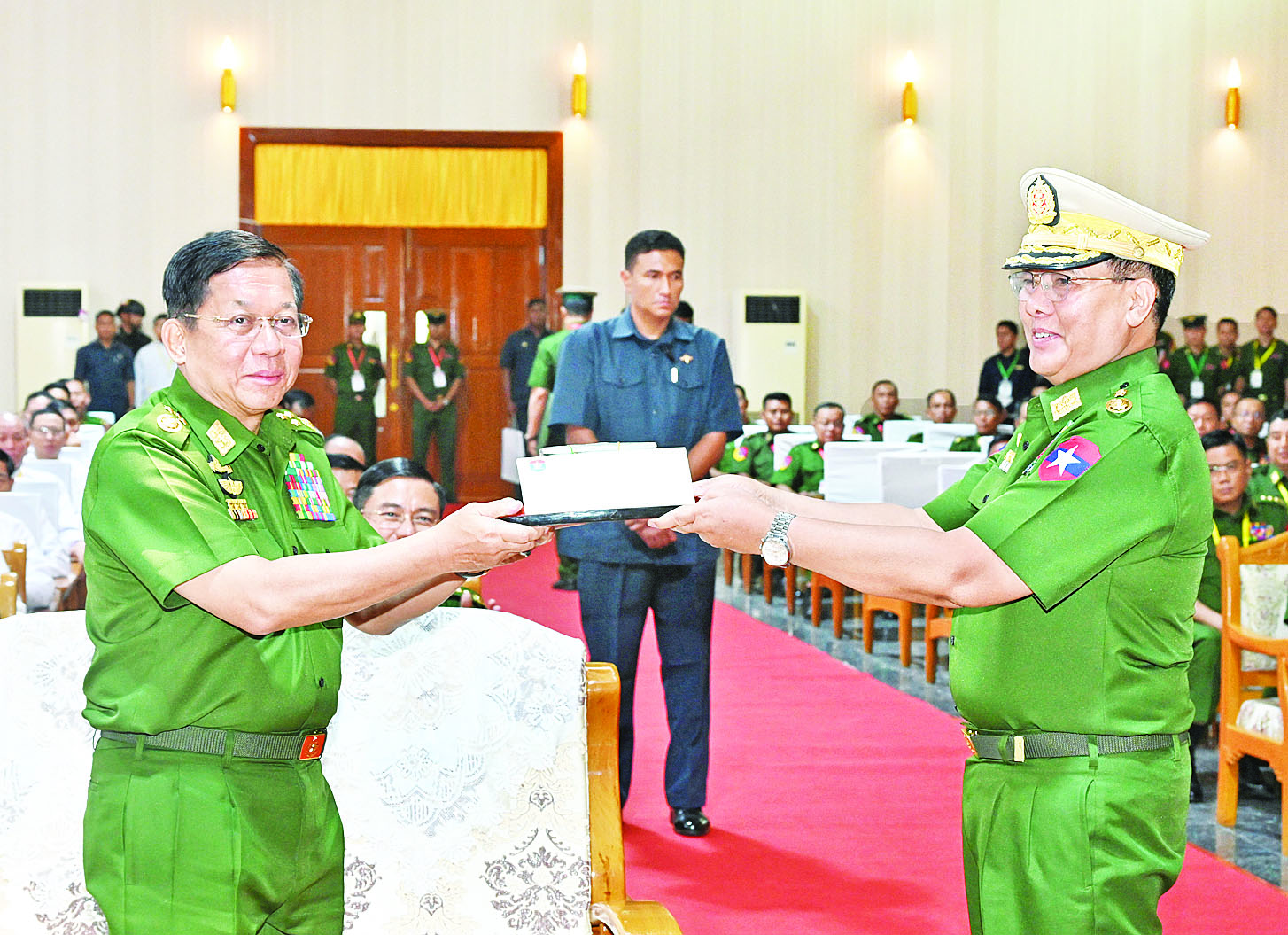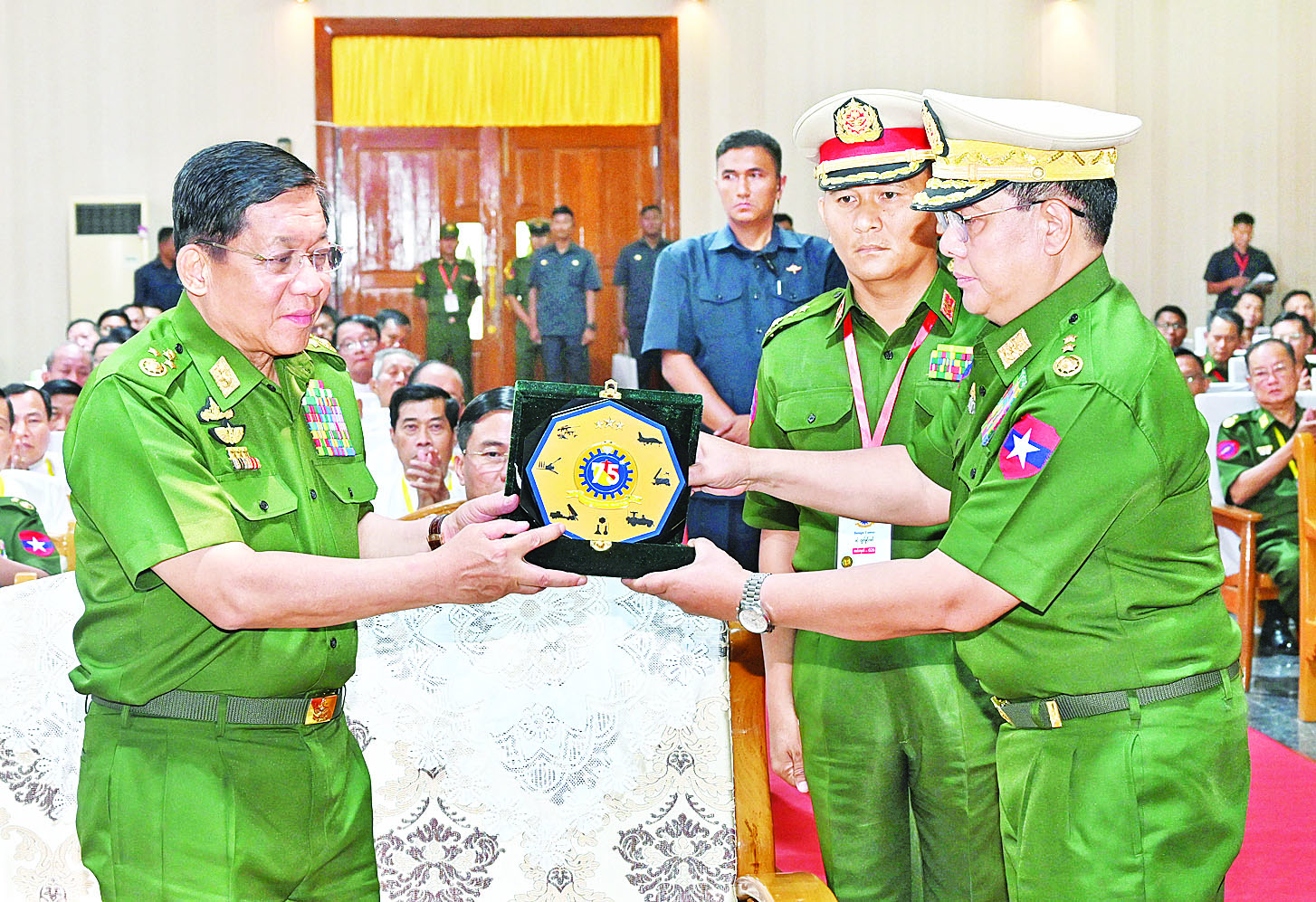 ယင်းနောက် နိုင်ငံတော်စီမံအုပ်ချုပ်ရေးကောင်စီဥက္ကဋ္ဌ တပ်မတော်ကာကွယ်ရေးဦးစီးချုပ်ထံ ကာကွယ်ရေးပစ္စည်းထုတ် လုပ်ရေးအရာရှိချုပ်က (၇၅)နှစ်မြောက် စိန်ရတုကာကွယ်ရေး ပစ္စည်းထုတ်လုပ်မှုတပ်ဖွဲ့နေ့ အထိမ်းအမှတ်လက်ဆောင်ကို ဂါရဝပြုပေးအပ်ပြီး နိုင်ငံတော်စီမံအုပ်ချုပ်ရေးကောင်စီဥက္ကဋ္ဌ တပ်မတော်ကာကွယ်ရေးဦးစီးချုပ်က (၇၅)နှစ်မြောက် စိန်ရတုကာကွယ်ရေးပစ္စည်းထုတ်လုပ်မှု တပ်ဖွဲ့နေ့အထိမ်းအမှတ် ဂုဏ်ပြုချီးမြှင့်ငွေကို ပြန်လည်ပေးအပ်သည်။