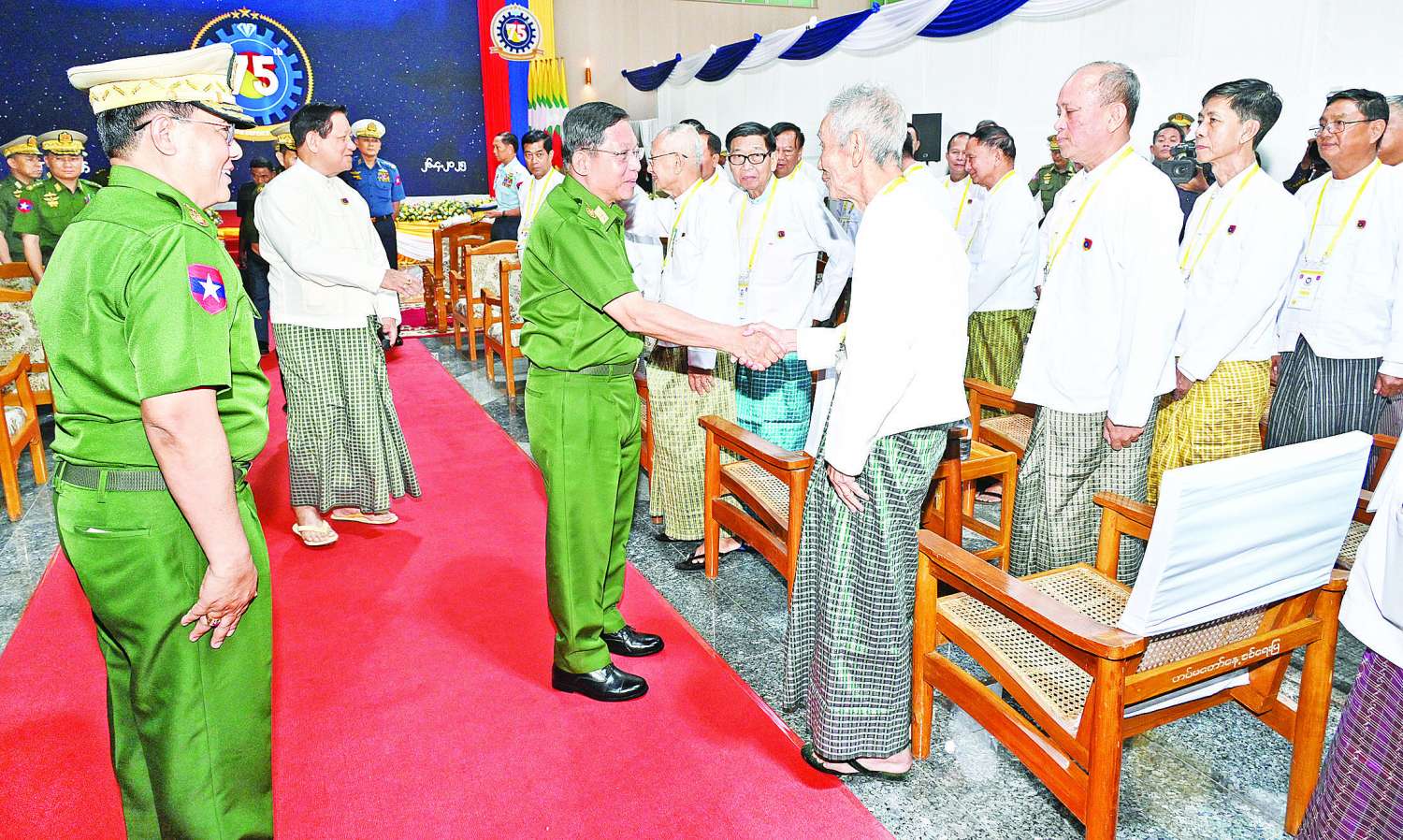 (၇၅)နှစ်မြောက် စိန်ရတုကာကွယ်ရေးပစ္စည်းထုတ်လုပ်မှုတပ်ဖွဲ့နေ့ အခမ်းအနားကို ယနေ့နံနက်ပိုင်းတွင် နေပြည်တော်ကောင်စီနယ်မြေအတွင်းရှိ နယ်မြေခံတပ်ဌာနချုပ်ခန်းမ၌ ကျင်းပပြုလုပ်ရာ နိုင်ငံတော်စီမံအုပ်ချုပ်ရေးကောင်စီဥက္ကဋ္ဌ တပ်မတော်ကာကွယ်ရေးဦးစီးချုပ် ဗိုလ်ချုပ်မှူးကြီး မင်းအောင်လှိုင် တက်ရောက်ချီးမြှင့်သည်။