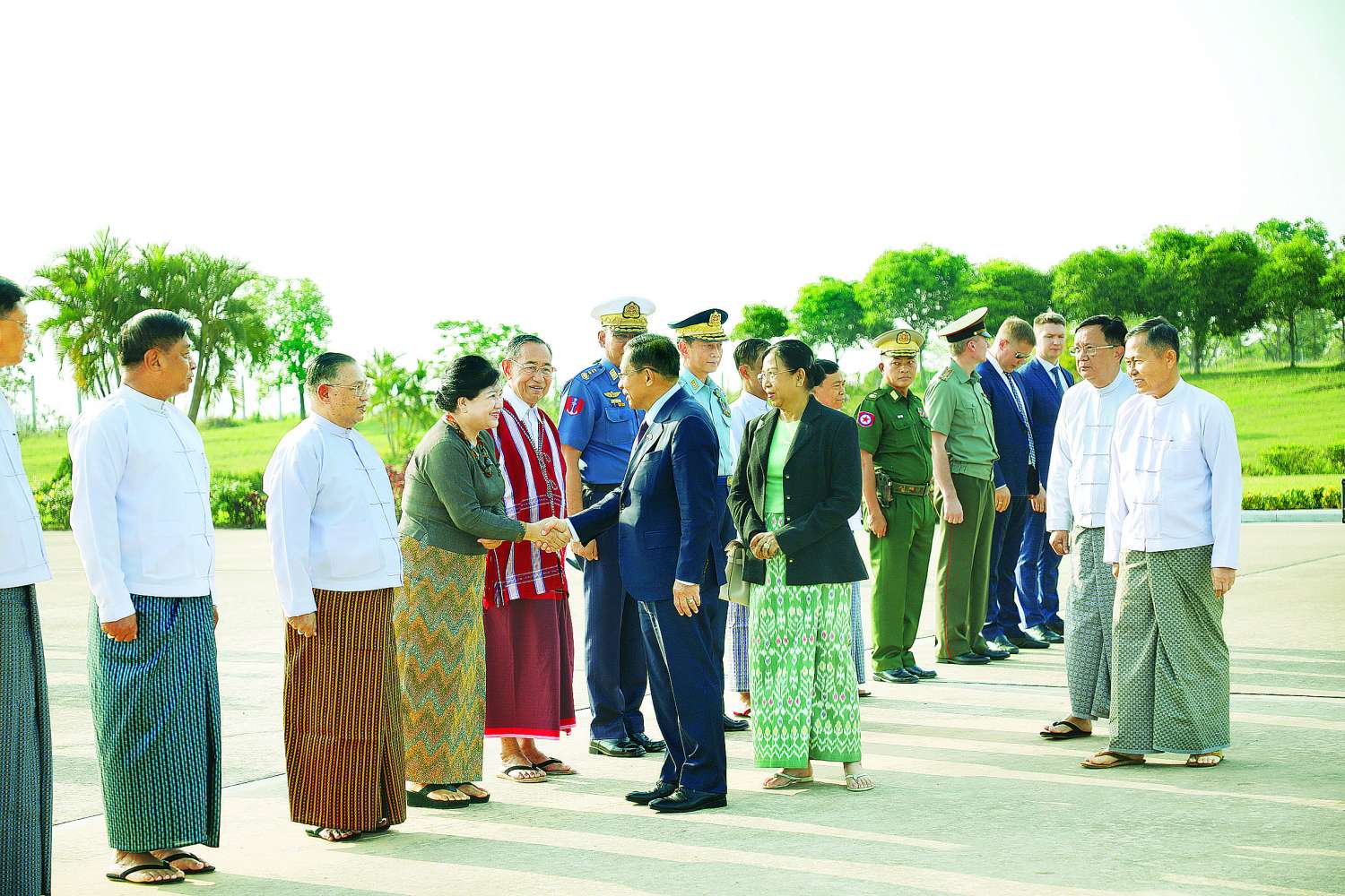 နိုင်ငံတော်စီမံအုပ်ချုပ်ရေးကောင်စီဥက္ကဋ္ဌ နိုင်ငံတော်ဝန်ကြီးချုပ်နှင့် ဇနီး ဦးဆောင်သည့် မြန်မာအဆင့်မြင့်ကိုယ်စားလှယ်အဖွဲ့အား ကောင်စီဒုတိယဥက္ကဋ္ဌ ဒုတိယဝန်ကြီးချုပ် ဒုတိယဗိုလ်ချုပ်မှူးကြီး စိုးဝင်းနှင့် ဇနီး ဒေါ်သန်းသန်းနွယ်၊ ကောင်စီအတွင်းရေးမှူး ဗိုလ်ချုပ်ကြီး အောင်လင်းဒွေးနှင့် ဇနီး၊ ကောင်စီအဖွဲ့ဝင်များ၊ ပြည်ထောင်စုဝန်ကြီးများ၊ နေပြည်တော်ကောင်စီဥက္ကဋ္ဌ၊ ကာကွယ်ရေးဦးစီးချုပ်ရုံးမှ အဆင့်မြင့်တပ်မတော်အရာရှိကြီးများနှင့် ဇနီးများ၊ နေပြည်တော်တိုင်းစစ်ဌာနချုပ် တိုင်းမှူး၊ မြန်မာနိုင်ငံဆိုင်ရာ ရုရှားဖက်ဒရေးရှင်းနိုင်ငံသံရုံး၊ စစ်သံရုံးတို့မှ တာဝန်ရှိသူများက လေဆိပ်၌ ပို့ဆောင်နှုတ်ဆက်ကြသည်။