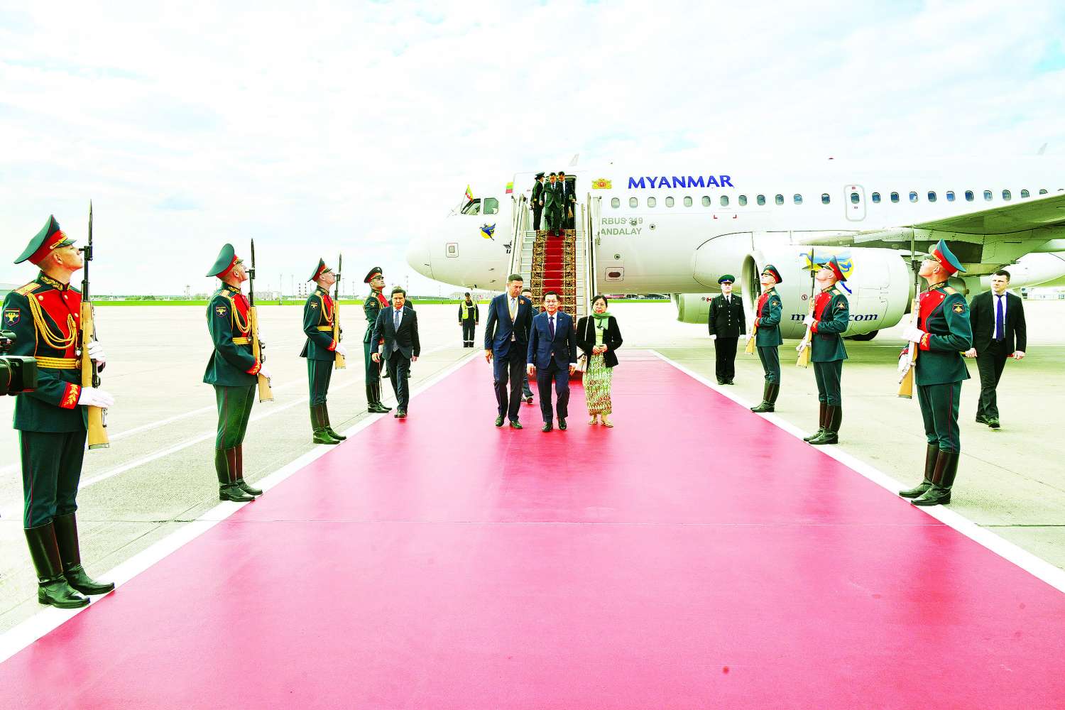 ရုရှားဖက်ဒရေးရှင်းနိုင်ငံသမ္မတ မစ္စတာ ဗလာဒီမာပူတင်၏ ဖိတ်ကြားချက်အရ ရုရှားဖက်ဒရေးရှင်းနိုင်ငံတွင် ကျင်းပပြုလုပ်မည့် ၁၉၄၁-၁၉၄၅ မဟာမျိုးချစ် စစ်ပွဲကြီးအောင်ပွဲ နှစ် (၈၀) ပြည့် အထိမ်းအမှတ် စစ်ရေးပြအခမ်းအနားသို့ တက်ရောက်ရန်အတွက် နိုင်ငံတော်စီမံအုပ်ချုပ်ရေးကောင်စီဥက္ကဋ္ဌ နိုင်ငံတော်ဝန်ကြီးချုပ် ဗိုလ်ချုပ်မှူးကြီး မင်းအောင်လှိုင်နှင့် ဇနီး ဒေါ်ကြူကြူလှ ဦးဆောင်သည့် မြန်မာအဆင့်မြင့် ကိုယ်စားလှယ်အဖွဲ့သည် ယနေ့နံနက်ပိုင်းတွင် အထူးလေယာဉ်ဖြင့် နေပြည်တော်တပ်မတော်လေဆိပ်မှ ထွက်ခွာသည်။