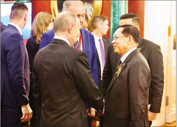 နိုင်ငံတော်စီမံအုပ်ချုပ်ရေးကောင်စီဥက္ကဋ္ဌ နိုင်ငံတော်ဝန်ကြီးချုပ် ဗိုလ်ချုပ်မှူးကြီး မင်းအောင်လှိုင် ရုရှားဖက်ဒရေးရှင်းနိုင်ငံသမ္မတ မစ္စတာဗလာဒီမာပူတင်မှ တည်ခင်းဧည့်ခံသည့်ညစာစားပွဲသို့ အခြားနိုင်ငံ့အကြီးအကဲများနှင့်အတူ ပါဝင်တက်ရောက်