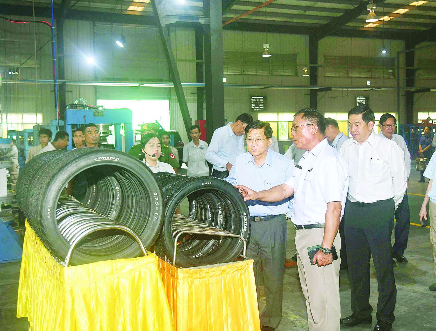 ထို့နောက် နိုင်ငံတော်စီမံအုပ်ချုပ်ရေးကောင်စီဥက္ကဋ္ဌ နိုင်ငံတော်ဝန်ကြီးချုပ်နှင့် အဖွဲ့ဝင်များသည် မြန်မာစီးပွားရေးကော်ပိုရေးရှင်း၊ တာယာစက်ရုံ (ရွာမ) မော်တော်ဆိုင်ကယ်တာယာနှင့် ကျွတ်ထုတ်လုပ်သည့် အလုပ်ရုံသို့ ရောက်ရှိစစ်ဆေးရာ စက်ရုံမှူးနှင့် တာဝန်ရှိသူများက မော်တော်ဆိုင်ကယ်၊ သုံးဘီးမော်တော်ဆိုင်ကယ်တာယာများနှင့်ကျွတ်များ ထုတ်လုပ်နေမှုအခြေအနေများကို ရှင်းလင်းတင်ပြသည်။