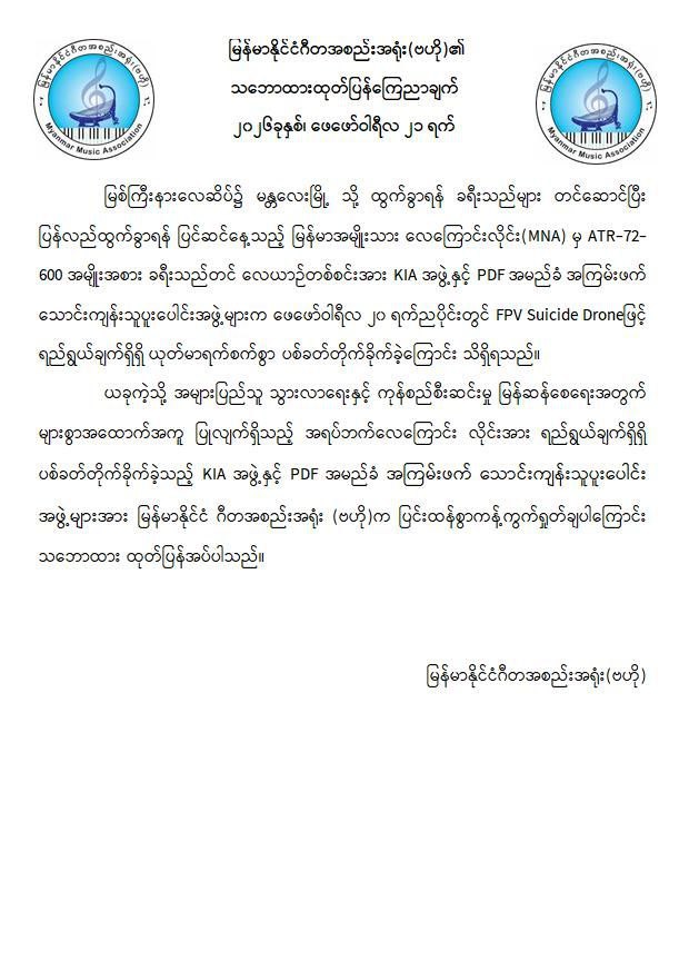 အဆိုပါ ကချင်ပြည်နယ်၏ အဓိကလေကြောင်းဗဟိုချက်တစ်ခုဖြစ်သော အများပြည်သူသွားလာရေးနှင့် ကုန်စည်စီးဆင်းမှုမြန်ဆန်စေရေးအတွက် များစွာအထောက်အကူပြုလျက်ရှိသည့် မြစ်ကြီးနားလေဆိပ်အား KIA အဖွဲ့နှင့် PDFအမည်ခံ အကြမ်းဖက် သောင်းကျန်းသူပူးပေါင်းအဖွဲ့များက ဖေဖော်ဝါရီ ၂၀ ရက် ည ၈ နာရီ ၁၂ မိနစ်ခန့်တွင် FPV Suicide Drone များအသုံးပြု၍ ခရီးသွားပြည်သူများ သေဆုံး၊ ထိခိုက်ဒဏ်ရာရရှိစေရန် ယုတ်မာပက်စက်သော ရည်ရွယ်ချက်ဖြင့် ပစ်ခတ်တိုက်ခိုက်ခဲ့သဖြင့် မြန်မာအမျိုးသားလေကြောင်းလိုင်း (MNA) မှ မြစ်ကြီးနားလေဆိပ်မှ မန္တလေးမြို့သို့ ထွက်ခွာရန်အတွက် ခရီးသည်များတင်ဆောင်ပြီး ပြန်လည်ထွက်ခွာရန် ပြင်ဆင်နေသည့် ATR-72-600 အမျိုးအစား ခရီးသည်တင်လေယာဉ်၏ ခေါင်းပိုင်း၊ ကိုယ်ထည်အလယ်ပိုင်းနှင့် နောက်မီးပိုင်းတို့တွင် ဗုံးစထိမှန်ပျက်စီးခဲ့ပြီး လေယာဉ်ခရီးစဉ်ရပ်နားခဲ့ရသည်။