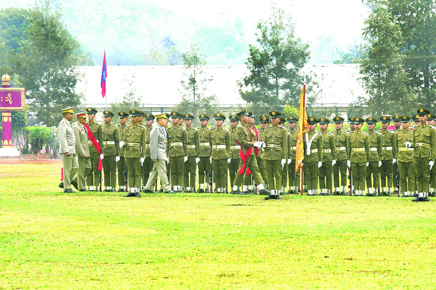 တပ်မတော်(ကြည်း)ဗိုလ်သင်တန်းကျောင်း(ဗထူး) ဗိုလ်လောင်းသင်တန်းအမှတ်စဉ်(၁၂၉) သီဟတပ်ခွဲသင်တန်းဆင်းဂုဏ်ပြုစစ်ရေးပြအခမ်းအနားကို ယနေ့နံနက်ပိုင်းတွင် ဗထူးမြို့တပ်မတော်(ကြည်း) ဗိုလ်သင်တန်းကျောင်း (ဗထူး) စစ်ရေးပြကွင်း၌ ကျင်းပရာ နိုင်ငံတော်လုံခြုံရေးနှင့်အေးချမ်းသာယာရေးကော်မရှင်ဥက္ကဋ္ဌ တပ်မတော်ကာကွယ်ရေးဦးစီးချုပ် ဗိုလ်ချုပ်မှူးကြီး သတိုးမဟာသရေစည်သူ သတိုးသီရိသုဓမ္မ မင်းအောင်လှိုင်(ကိုယ်စား) နိုင်ငံတော်လုံခြုံရေးနှင့်အေးချမ်းသာယာရေးကော်မရှင် ဒုတိယဥက္ကဋ္ဌ ဒုတိယတပ်မတော်ကာကွယ်ရေးဦးစီးချုပ် ကာကွယ်ရေးဦးစီးချုပ်(ကြည်း) ဒုတိယဗိုလ်ချုပ်မှူးကြီး သီရိပျံချီ မဟာသရေစည်သူ စိုးဝင်း တက်ရောက်မိန့်ခွန်းပြောကြားသည်။