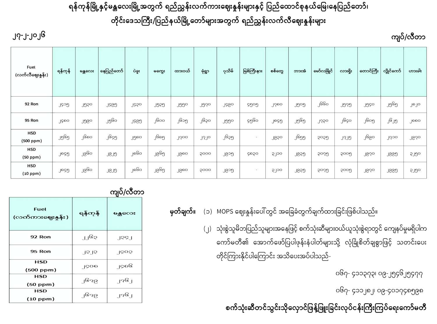 ရန်ကုန်မြို့နှင့် မန္တလေးမြို့အတွက် ရည်ညွှန်းလက်ကားဈေးနှုန်းများနှင့် ပြည်ထောင်စုနယ်မြေ နေပြည်တော်၊ တိုင်းဒေသကြီး/ပြည်နယ် မြို့တော်များအတွက် ရည်ညွှန်းလက်လီဈေးနှုန်းများ 02/27/2026