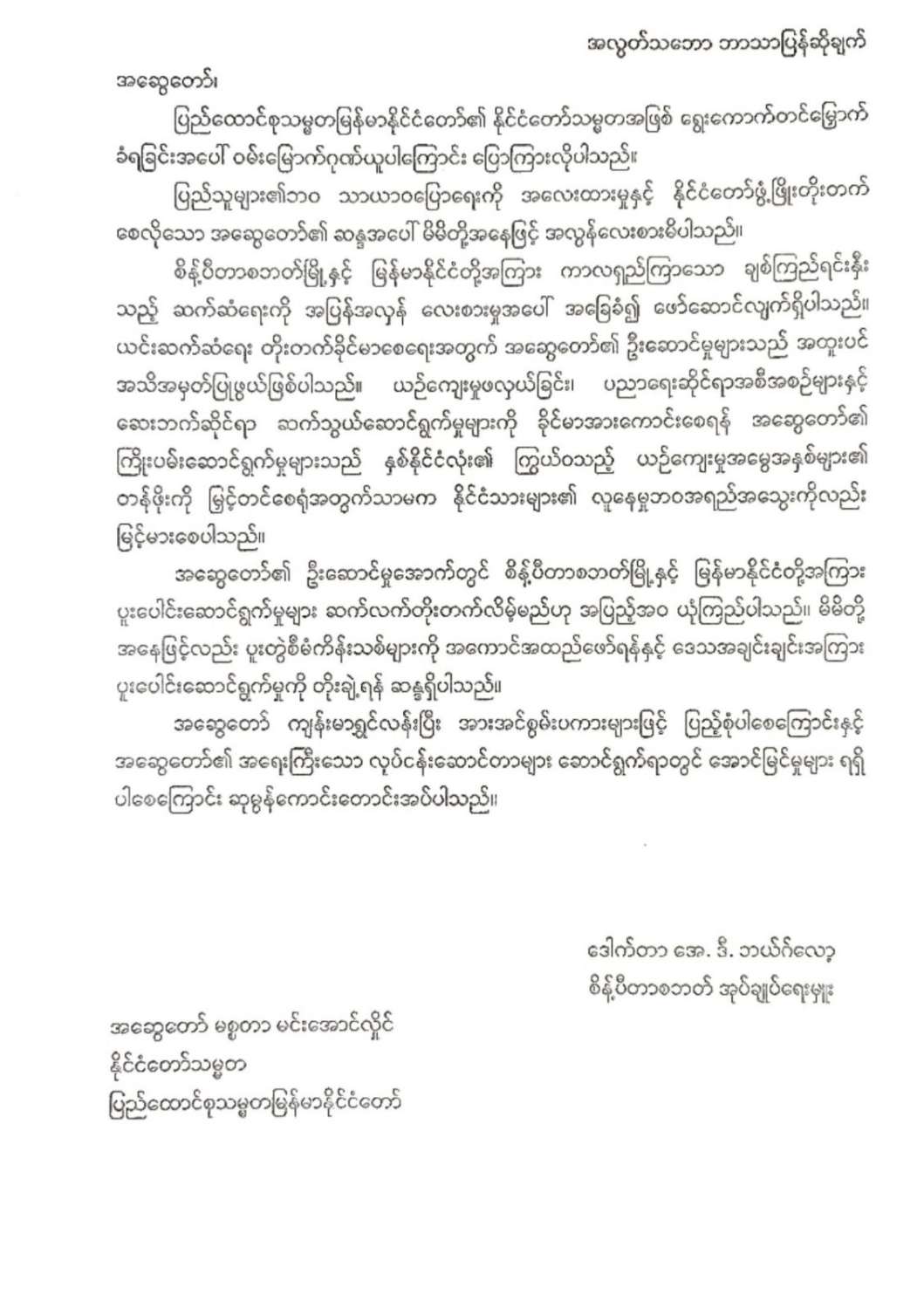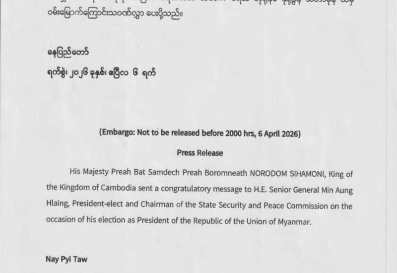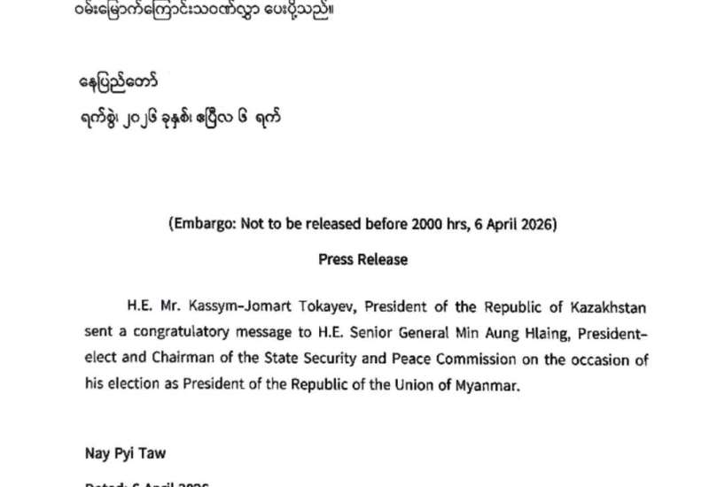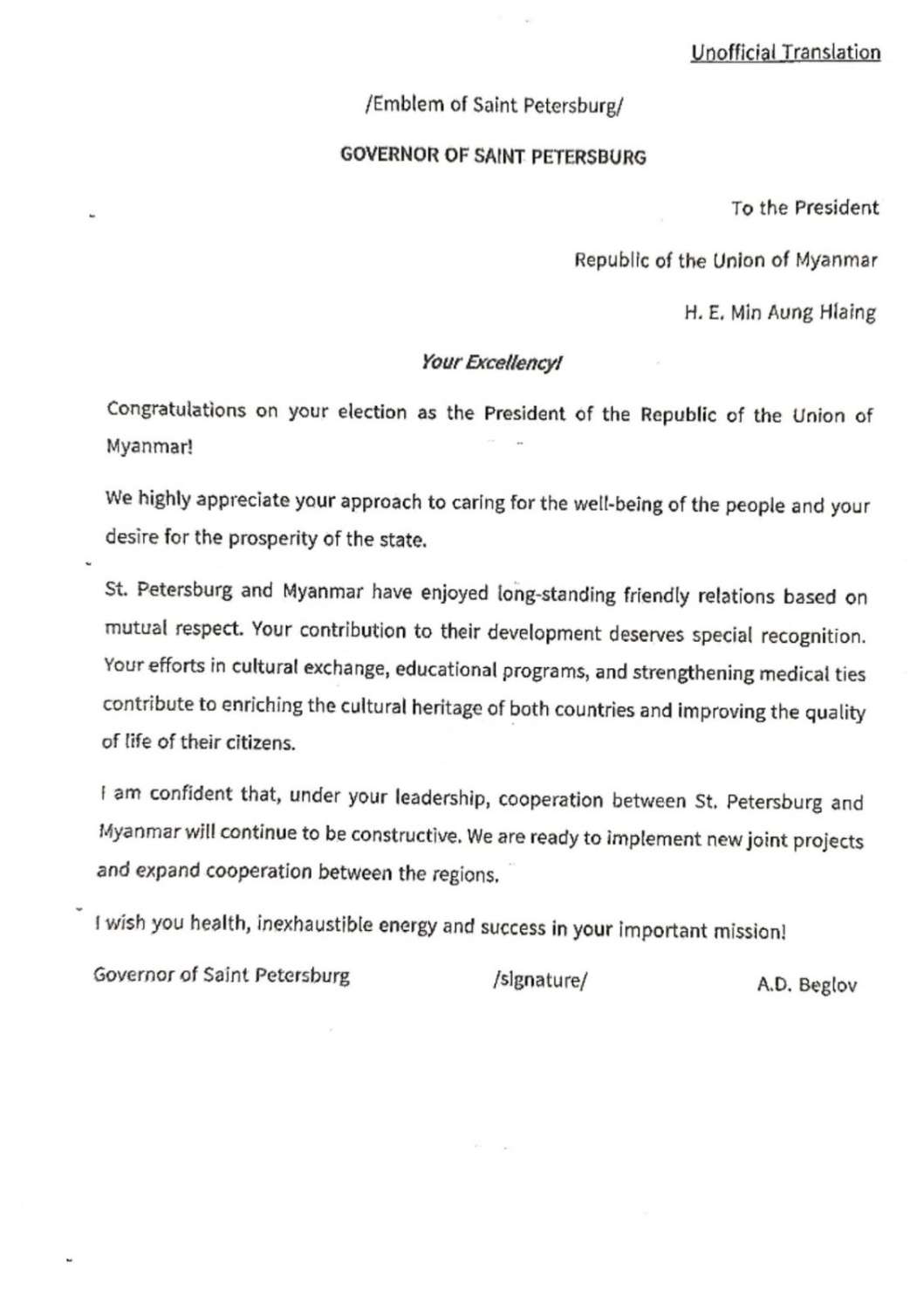 ပြည်ထောင်စုသမ္မတမြန်မာနိုင်ငံတော်၊ ရွေးကောက်တင်မြှောက်ခြင်းခံရသော သမ္မတ၊ နိုင်ငံတော်လုံခြုံရေးနှင့်အေးချမ်းသာယာရေးကော်မရှင်ဥက္ကဋ္ဌ ဗိုလ်ချုပ်မှူးကြီး မင်းအောင်လှိုင်ထံသို့ ရုရှားဖက်ဒရေးရှင်းနိုင်ငံ စိန့်ပီတာစဘတ်အုပ်ချုပ်ရေးမှူး မစ္စတာ အလက်ဇန်းဒါး ဘယ်ဂ်လော့ထံမှ ဝမ်းမြောက်ကြောင်းသဝဏ်လွှာ ပေးပို့