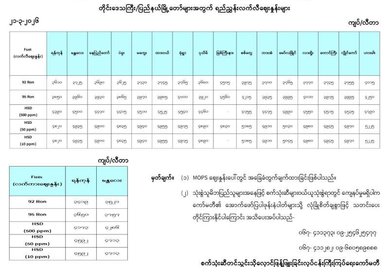 ရန်ကုန်မြို့နှင့် မန္တလေးမြို့အတွက် ရည်ညွှန်းလက်ကားဈေးနှုန်းများနှင့် ပြည်ထောင်စုနယ်မြေ နေပြည်တော်၊ တိုင်းဒေသကြီး/ပြည်နယ် မြို့တော်များအတွက် ရည်ညွှန်းလက်လီဈေးနှုန်းများ