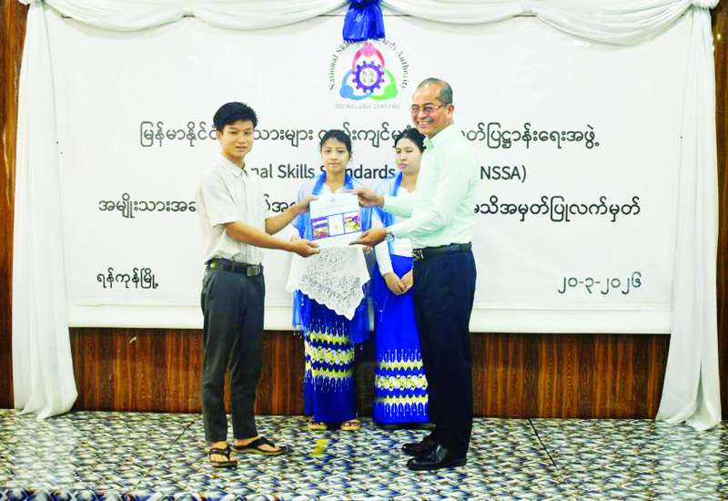 မြန်မာနိုင်ငံလုပ်သားများ ကျွမ်းကျင်မှုစံသတ်မှတ် ပြဋ္ဌာန်းရေးအဖွဲ့(NSSA) ၏ အမျိုးသားအဆင့် အလုပ်အကိုင်ဆိုင်ရာ ကျွမ်းကျင်မှုအသိအမှတ်ပြုလက်မှတ်ပေးအပ်ပွဲကို ယနေ့နံနက်ပိုင်းတွင် ရန်ကင်းမြို့နယ်ရှိ ကျွမ်းကျင်မှုလေ့ကျင့်ရေး သင်တန်းကျောင်း၌ကျင်းပရာ အလုပ်သမားဝန်ကြီးဌာန ဒုတိယဝန်ကြီး ဦးဝင်းရှိန်နှင့် သက်ဆိုင်ရာတာဝန်ရှိသူများ တက်ရောက်ကြသည်။