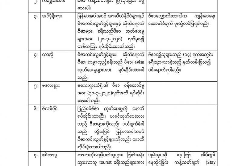 COVID-19 အသက်ရှူလမ်းကြောင်းဆိုင်ရာ ကူးစက်ရောဂါ ပြည်ပမှကူးစက်မှုများ ကာကွယ် တားဆီးရေးအတွက်လည်းကောင်း၊ ခရီးသွားစဉ် မမျှော်လင့်သော ကန့်သတ်ချက်များနှင့် ကြုံတွေ့နိုင်ခြင်းကြောင့်လည်းကောင်း၊ မြန်မာနိုင်ငံသားများအနေဖြင့် ပြည်ပနိုင်ငံများ၊ အထူးသဖြင့် ရောဂါ ကူးစက်မှုမြင့်မားနေသည့်နိုင်ငံများသို့ မလွှဲမရှောင်သာကိစ္စများမှလွဲ၍ ခရီးသွားလာမှုရှောင်ရှားကြပါရန် နိုင်ငံခြားရေးဝန်ကြီးဌာနမှ အကြံပြုထား သည်။