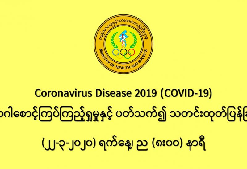 ၁။ ကျန်းမာရေးနှင့် အားကစားဝန်ကြီးဌာနသည် ကမ္ဘာ့နိုင်ငံများတွင် ကူးစက်ပျံ့နှံ့လျက်ရှိသည့် COVID-19 လတ်တလော အသက်ရှူလမ်းကြောင်းဆိုင်ရာ ရောဂါဖြစ်ပွားမှုဖြစ်စဉ်နှင့် ပတ်သက်၍ ရောဂါစောင့်ကြပ်ကြည့်ရှုခြင်းလုပ်ငန်းများအား အပြည်ပြည်ဆိုင်ရာ ဝင်ပေါက်၊ ထွက်ပေါက် ဂိတ်များတွင်လည်းကောင်း၊ ဆေးရုံအခြေပြု အဖြစ်လည်းကောင်း၊ ပြည်သူလူထု အခြေပြု စောင့်ကြပ်ကြည့်ရှုခြင်း လုပ်ငန်းများဖြင့်လည်းကောင်း၊ ပုဂ္ဂလိကဆေးရုံများနှင့် ပူးပေါင်း၍လည်းကောင်း ဆောင်ရွက်လျက် ရှိပါသည်။