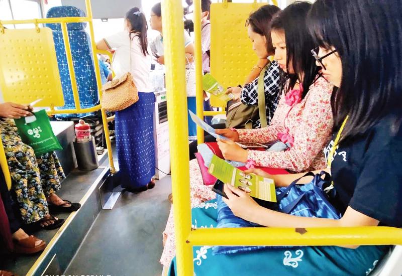 COVID-19 ရောဂါကြိုတင်ကာကွယ်ရေးအဖြစ် ရန်ကုန်တိုင်းဒေသကြီးအတွင်း ပြေးဆွဲနေသော YBS ယာဉ်လိုင်းအချို့တွင် လက်ဆေးနိုင် မည့် Hand Gel ဘူးများ တပ်ဆင်ခြင်း နှင့် ယာဉ်ပေါ်ပါခရီးသည်များအား အသိပညာပေးခြင်းကို မတ် ၂၀ ရက် နေ့လယ်ပိုင်းက စံပြဈေးမှတ်တိုင် တွင် စုပေါင်းလှုပ်ရှား ဆောင်ရွက် ကြောင်း သိရသည်။