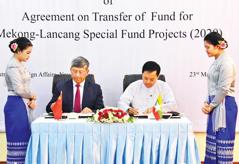 မဲခေါင် - လန်ချန်း ပူးပေါင်းဆောင်ရွက်မှု အထူးရန်ပုံငွေ (၂၀၂၀)ဖြင့် မြန်မာနိုင်ငံ ဝန်ကြီးဌာန (၁၀)ခုမှ အကောင်အထည်ဖော်ဆောင်ရွက်ခွင့်ရရှိသော စီမံကိန်း(၂၂)ခုအတွက် ရန်ပုံငွေ လွှဲပြောင်းလက်ခံလွှာ လက်မှတ်ရေးထိုးပွဲ အခမ်းအနားကို ယနေ့ မွန်းလွဲပိုင်းတွင် နိုင်ငံခြားရေးဝန်ကြီးဌာန၌ ကျင်းပရာ နိုင်ငံခြားရေးဝန်ကြီးဌာန၊ အမြဲတမ်းအတွင်းဝန် ဦးစိုးဟန်နှင့် မြန်မာနိုင်ငံဆိုင်ရာ တရုတ်ပြည်သူ့သမ္မတနိုင်ငံ သံအမတ်ကြီး မစ္စတာချန်းဟိုင်တို့ တက်ရောက် လက်မှတ် ရေးထိုးကြသည်။