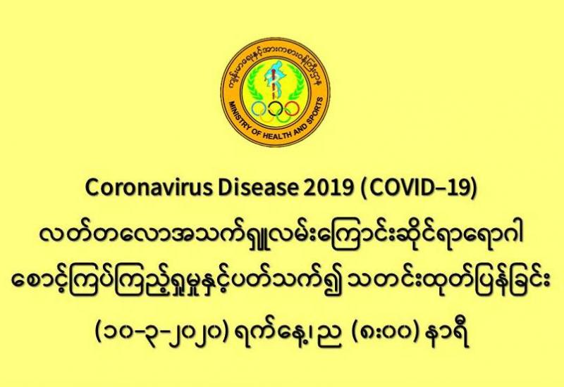 ၁။ ကျန်းမာရေးနှင့်အားကစားဝန်ကြီးဌာနသည် ကမ္ဘာ့နိုင်ငံများတွင် ကူးစက်ပျံ့နှံ့လျက်ရှိသည့် COVID-19 လတ်တလောအသက်ရှူလမ်းကြောင်းဆိုင်ရာ ရောဂါဖြစ်ပွားမှုဖြစ်စဉ်နှင့်ပတ်သက်၍ ရောဂါစောင့်ကြပ်ကြည့်ရှုခြင်း လုပ်ငန်းများအား အပြည်ပြည်ဆိုင်ရာ ဝင်ပေါက်၊ ထွက်ပေါက်ဂိတ် များတွင်လည်းကောင်း၊ ဆေးရုံအခြေပြုအဖြစ်လည်းကောင်း၊ ပြည်သူလူထုအခြေပြု စောင့်ကြပ် ကြည့်ရှုခြင်းလုပ်ငန်းများဖြင့်လည်းကောင်း၊ ပုဂ္ဂလိကဆေးရုံများနှင့် ပူးပေါင်း၍လည်းကောင်း ဆောင်ရွက်လျက်ရှိပါသည်။